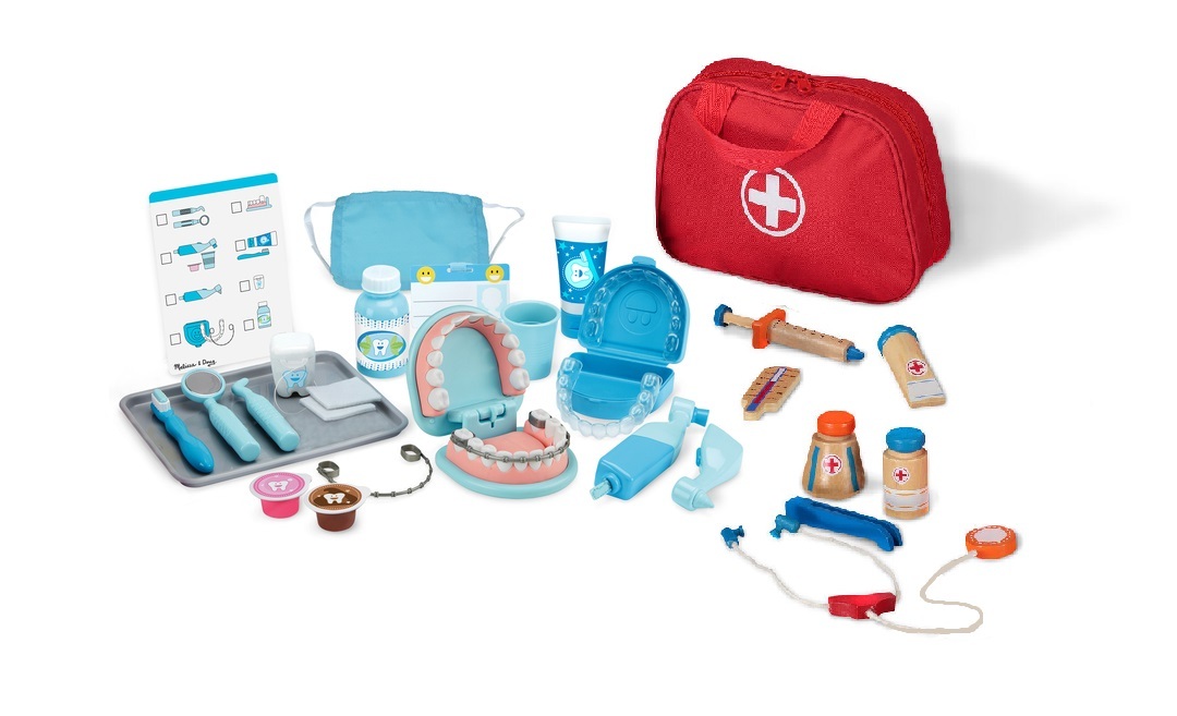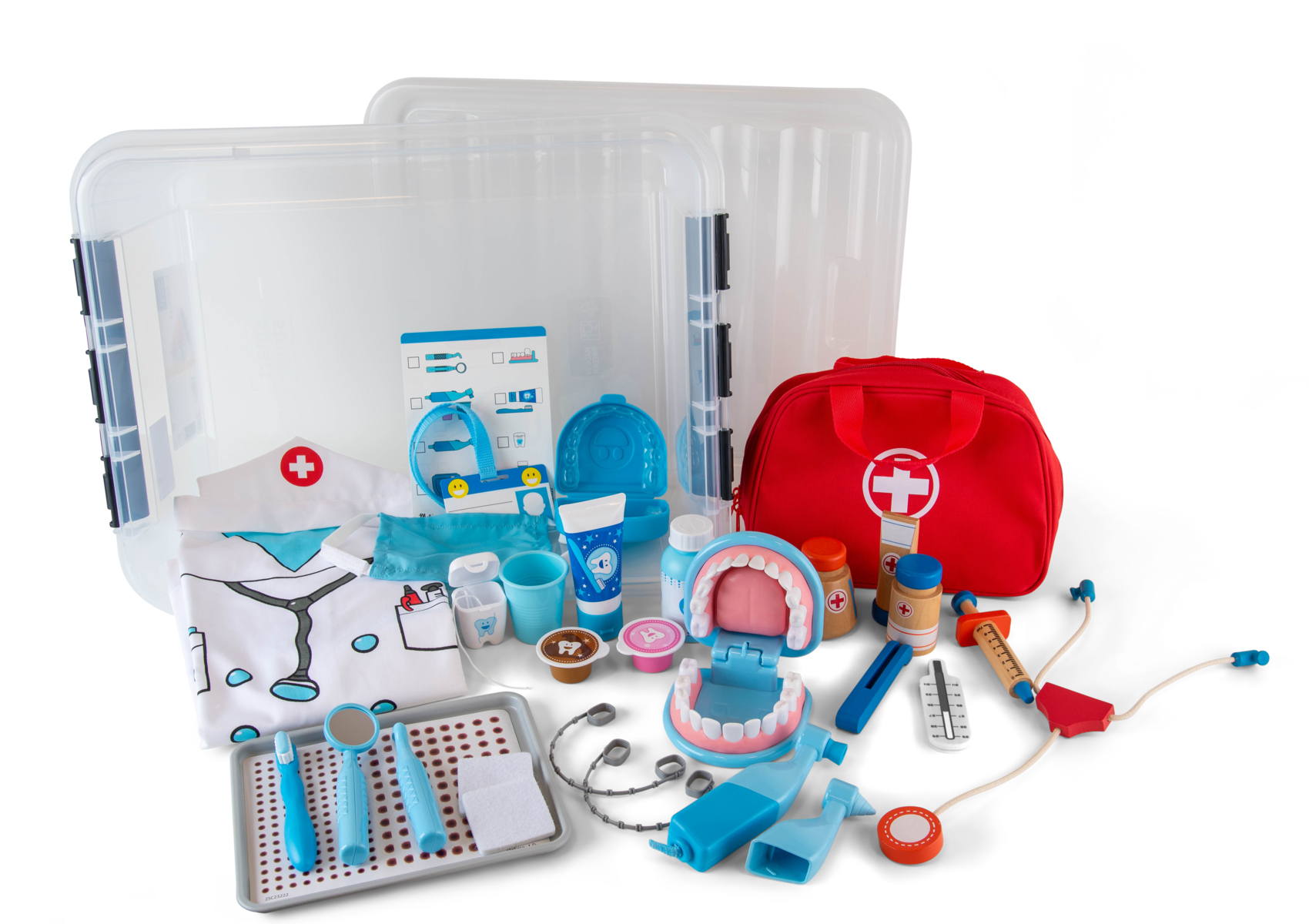 25 dele. Virkelighedstro tandplejeartikler til undersøgelser, reparationer etc. Brug det vibrerende værktøj med udskiftelige polere- og borehoveder, og rengør med tandbørste. De 4 bageste tænder kan vippes og løftes, så man kan øve sig i at trække tænder ud. Indeholder tænder, klistermærker med huller, undersøgelsesværktøjer, tandbørste, tandpastatube, skylleflaske og skyllekop, 2 gazebind, 2 tandpoleringskrus, tandbøjle, mundbind, ID-skilt med bånd og dobbeltsidet aktivitetskort. Af ABS, PP og EVA. Fra 3 år.