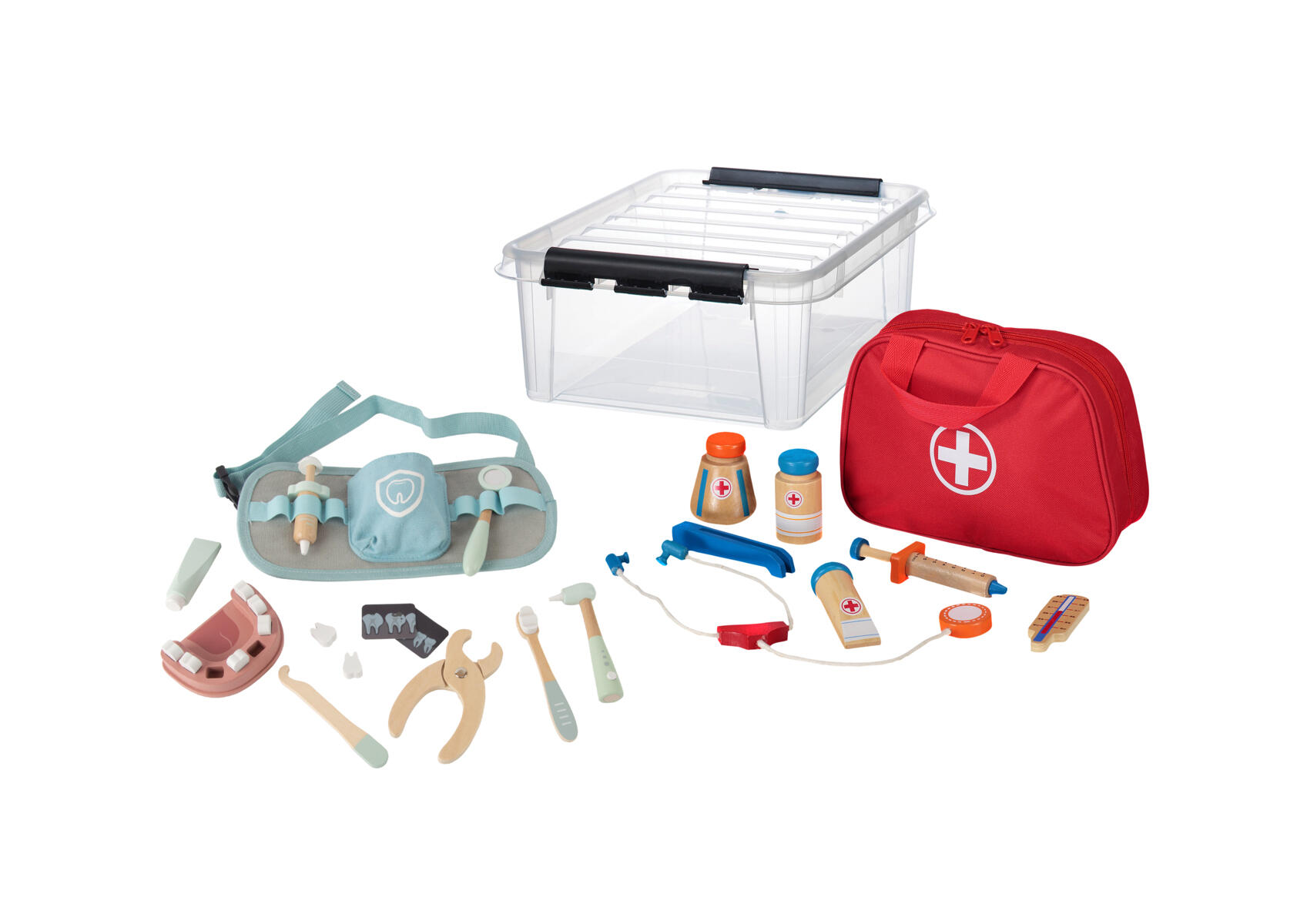 Denne legekasse indeholder lægekittel, lægetaske, tandlægesæt og opbevaringsboks med låg. PVC-fri. Fra 3 år.