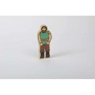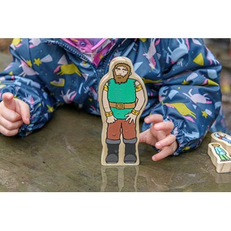 Fine træfigurer fra det velkendte eventyr om Hans og bønnestagen. Med disse figurer kan barnet genfortælle og lave egne versioner af eventyret. De kan også bruges af pædagogen til at få mere liv i fortællingen. Dobbeltsidige figurer af træ. Højde 3,5-18 cm. Fra 3 år.