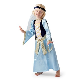 En udklædningsdragt i middelalderstil. Kjole i lyseblå satin med bælte i taljen og gulddetaljer. Krone med tyl følger med. Af polyester. Finvask 40°C. Passer til ca. 3-5 år.
