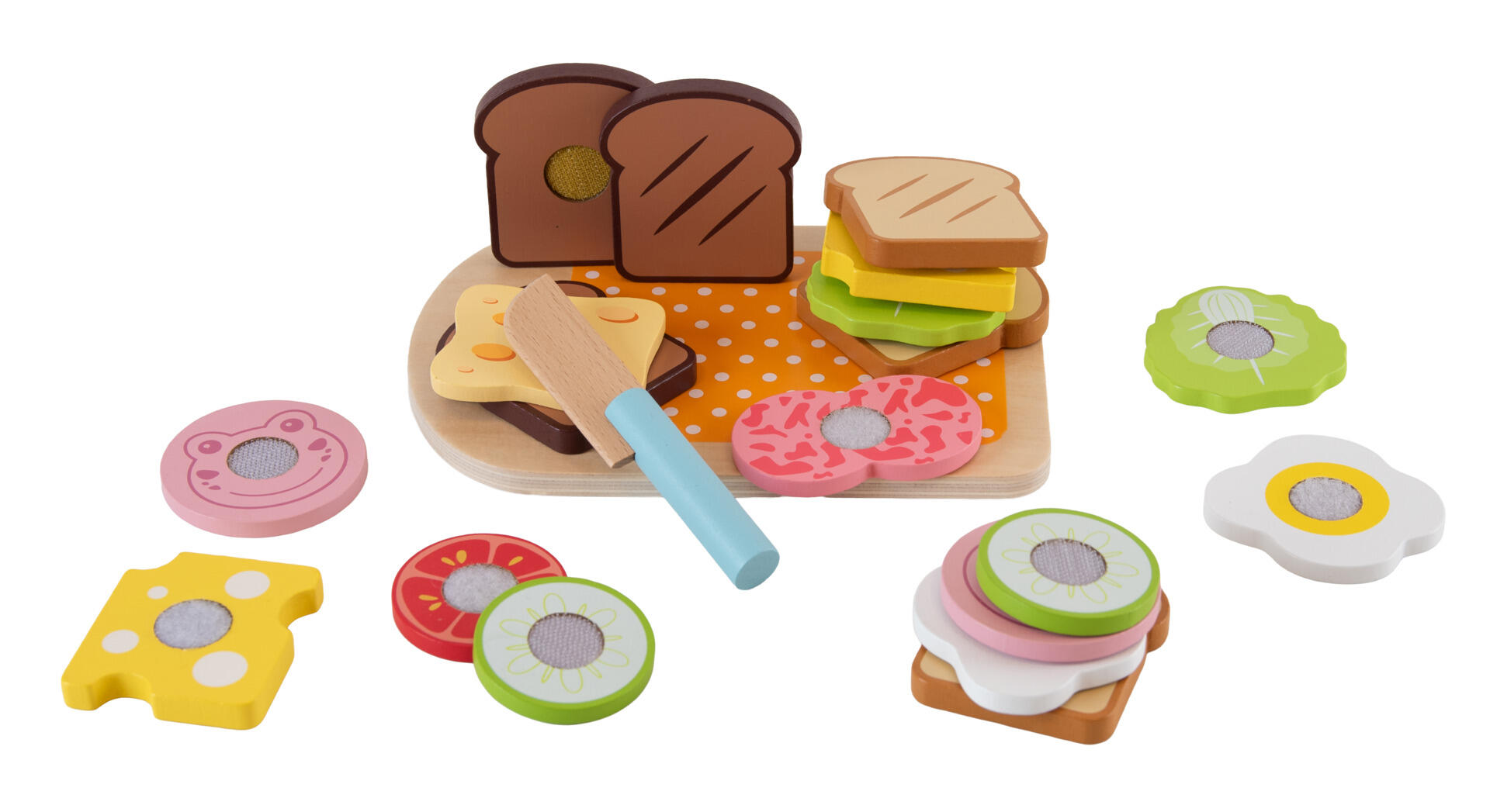 20 dele/pk. Lav en lækker sandwich med dette sæt med delbart brød, pålæg, skærebræt og brødkniv. Indeholder 6 skiver brød og 12 stk. pålæg med velcro mellem delene. Sættet indeholder pølse, æg, ost og andre favoritter. Alle dele er lavet af FSC-certificeret træ. Skærebrættet måler 19x13 cm. Fra 2 år.