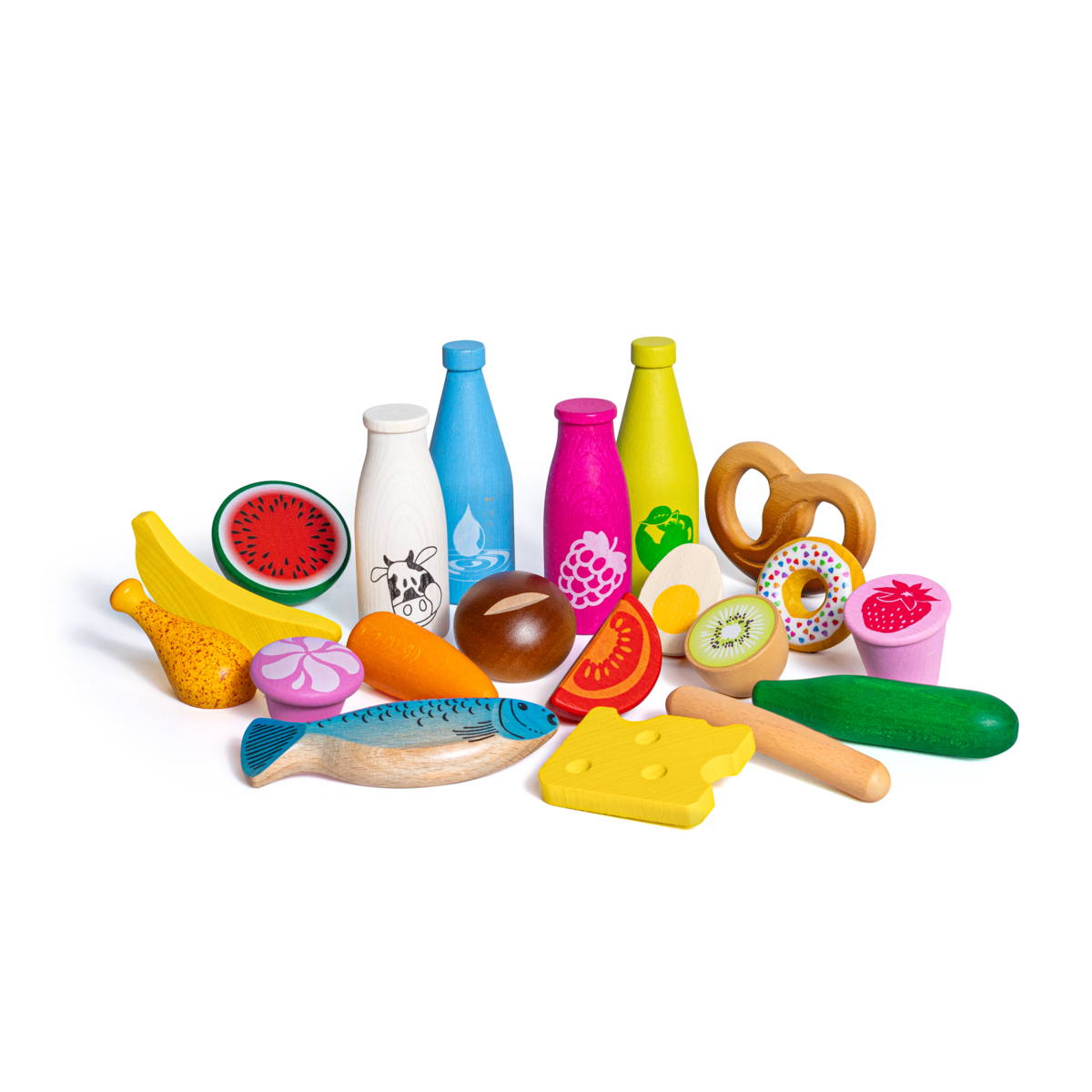 17 dele. Indeholder løg, gulerod, agurk, tomat, radise, hvidløg, citron, melon m.m. Mål på gulerod: 12 cm. Af FSC-certificeret genplantet gummitræ. Fra 3 år.