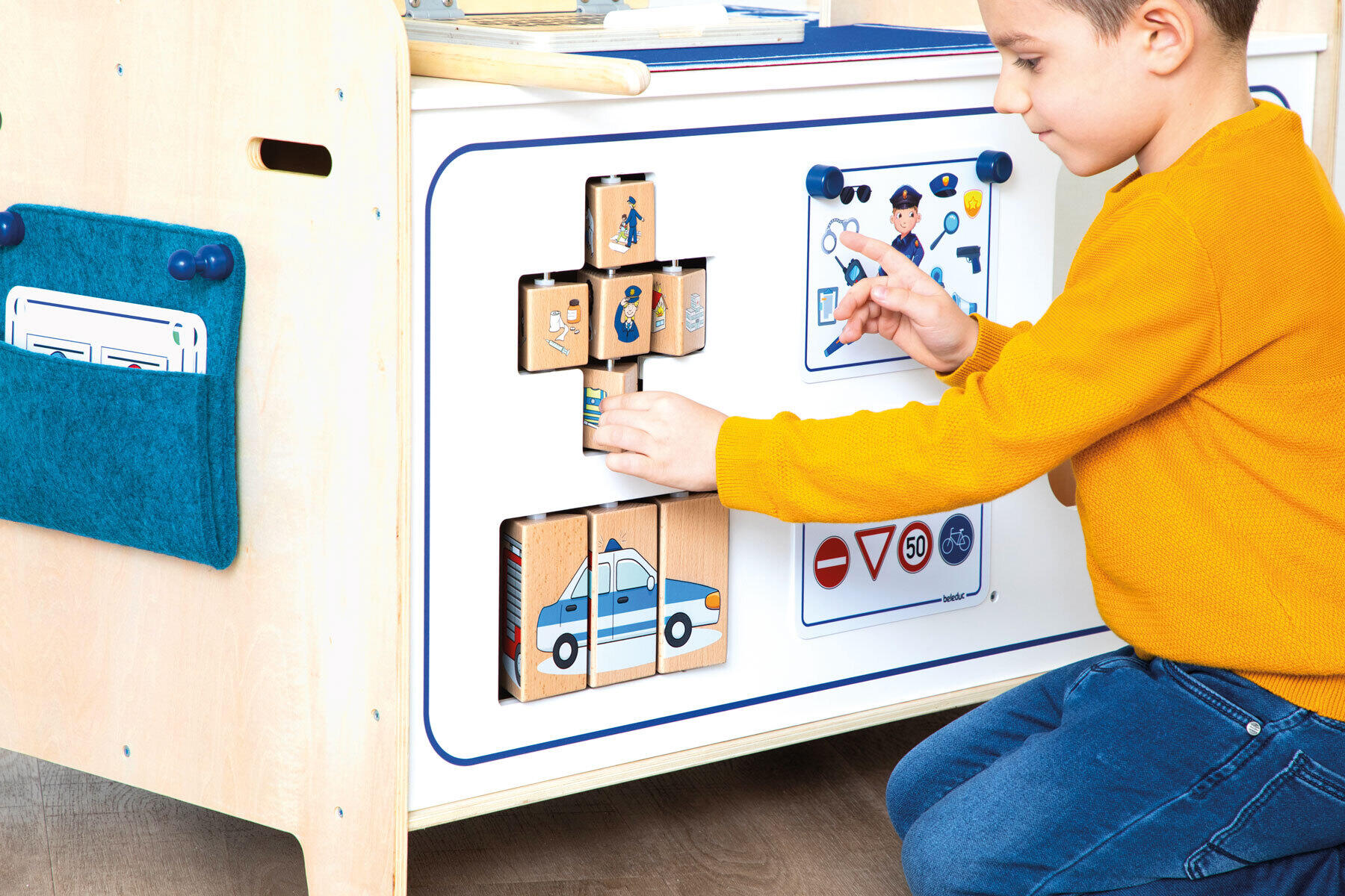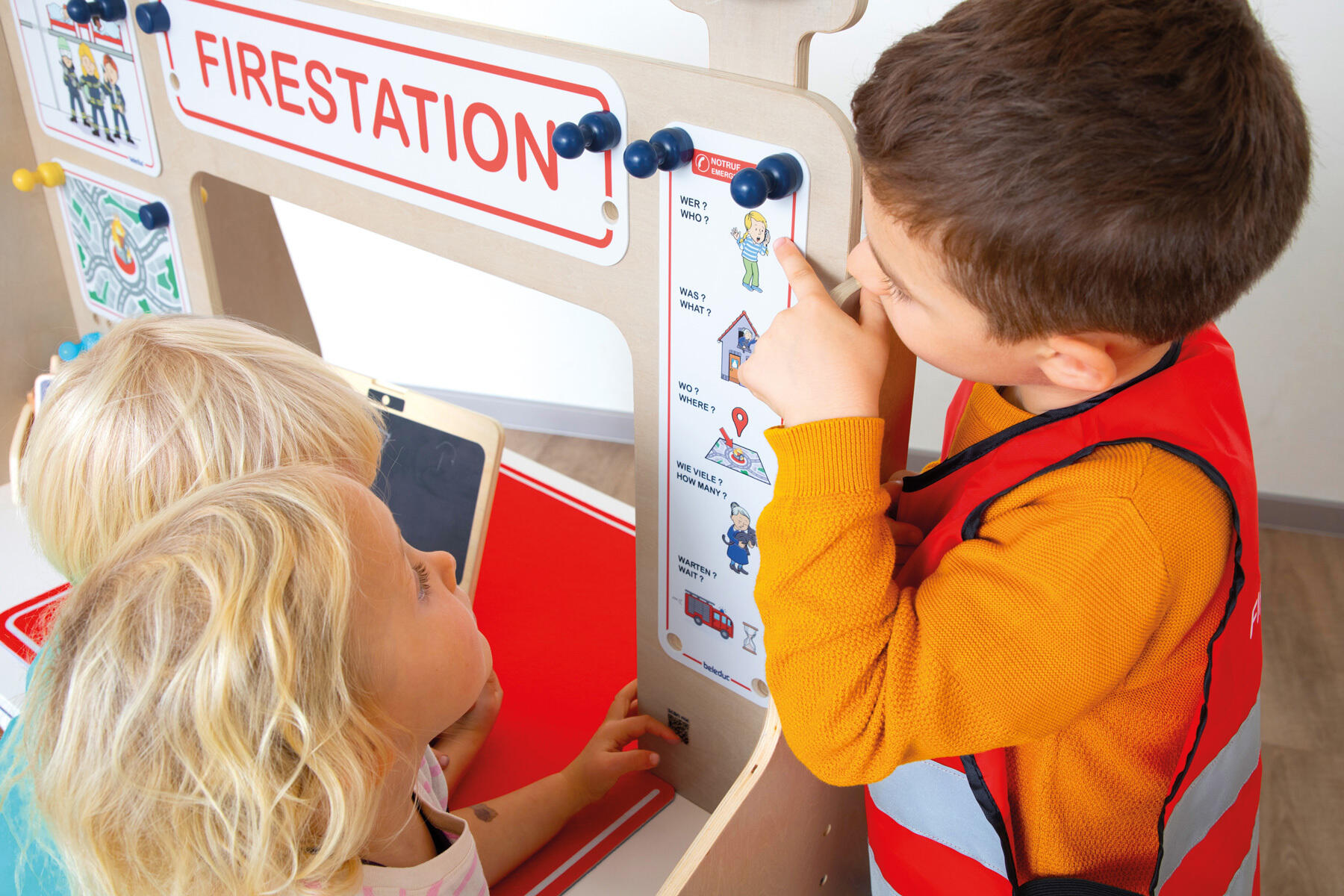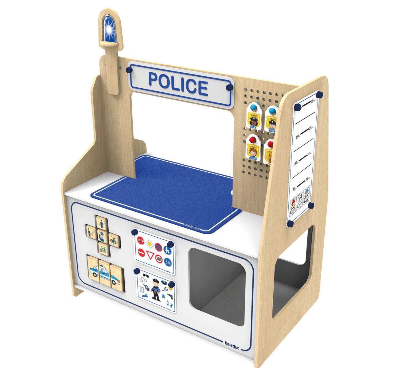 Farverigt legecenter med to forskellige scener. Med de medfølgende lege- og forklaringskort samt den dobbeltsidigt trykte bordmåtte kan børnene nemt forvandle politistationen til en brandstation. Oprulningsblokken viser forskellige motiver fra politi- og brandvæsen. Mål: 95,5×56×126 cm. PVC-fri. Fremstillet af PS, FSC-certificeret MDF og krydsfiner. Fra 3 år.