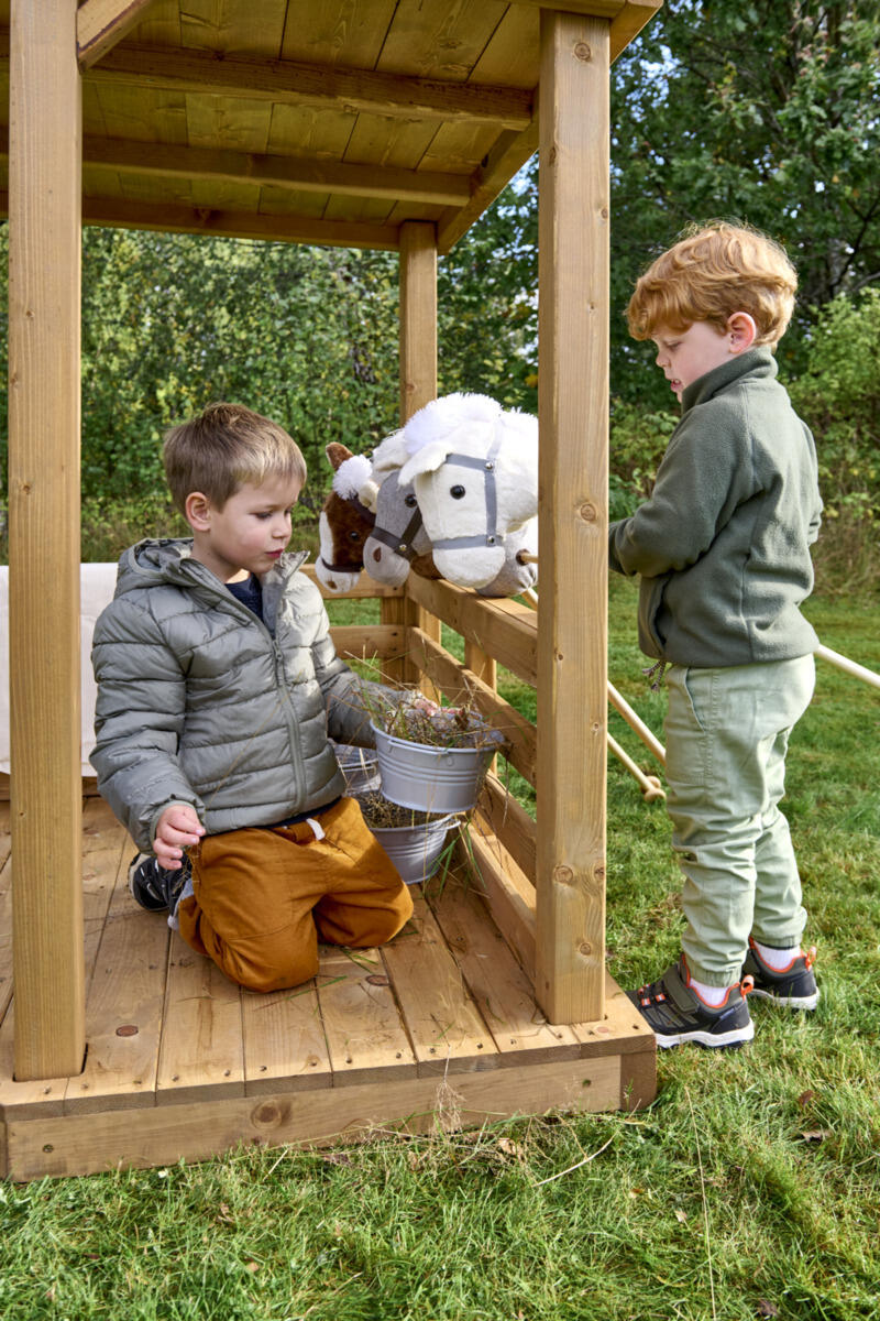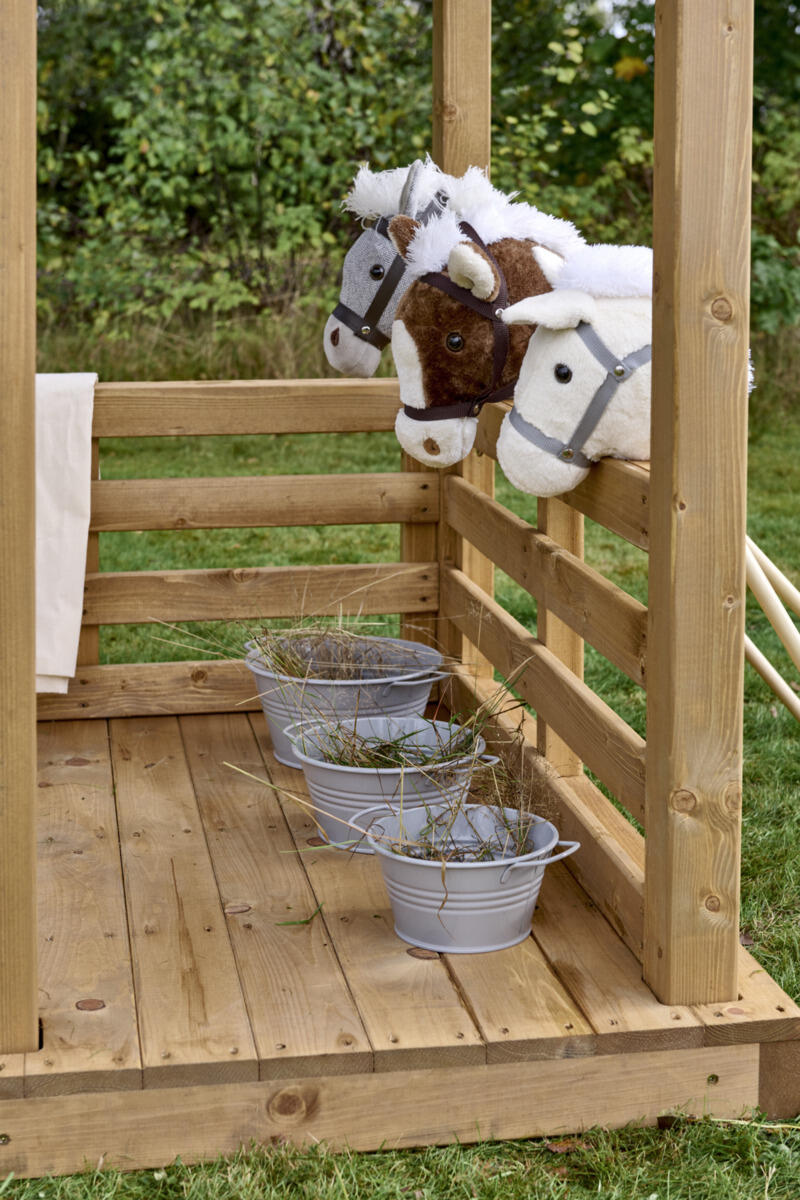 Stald med 2 båse til kæphestene. De to låger gør det nemt at få hesten ind og ud. Til hver hest er der en aftagelig holder og en lille tavle, hvor man kan skrive hestens navn på. Bør vægmonteres for bedst mulig stabilitet. Mål: 60x22,5x104 cm. Af FSC-certificeret træ, MDF og krydsfiner. Fra 3 år.