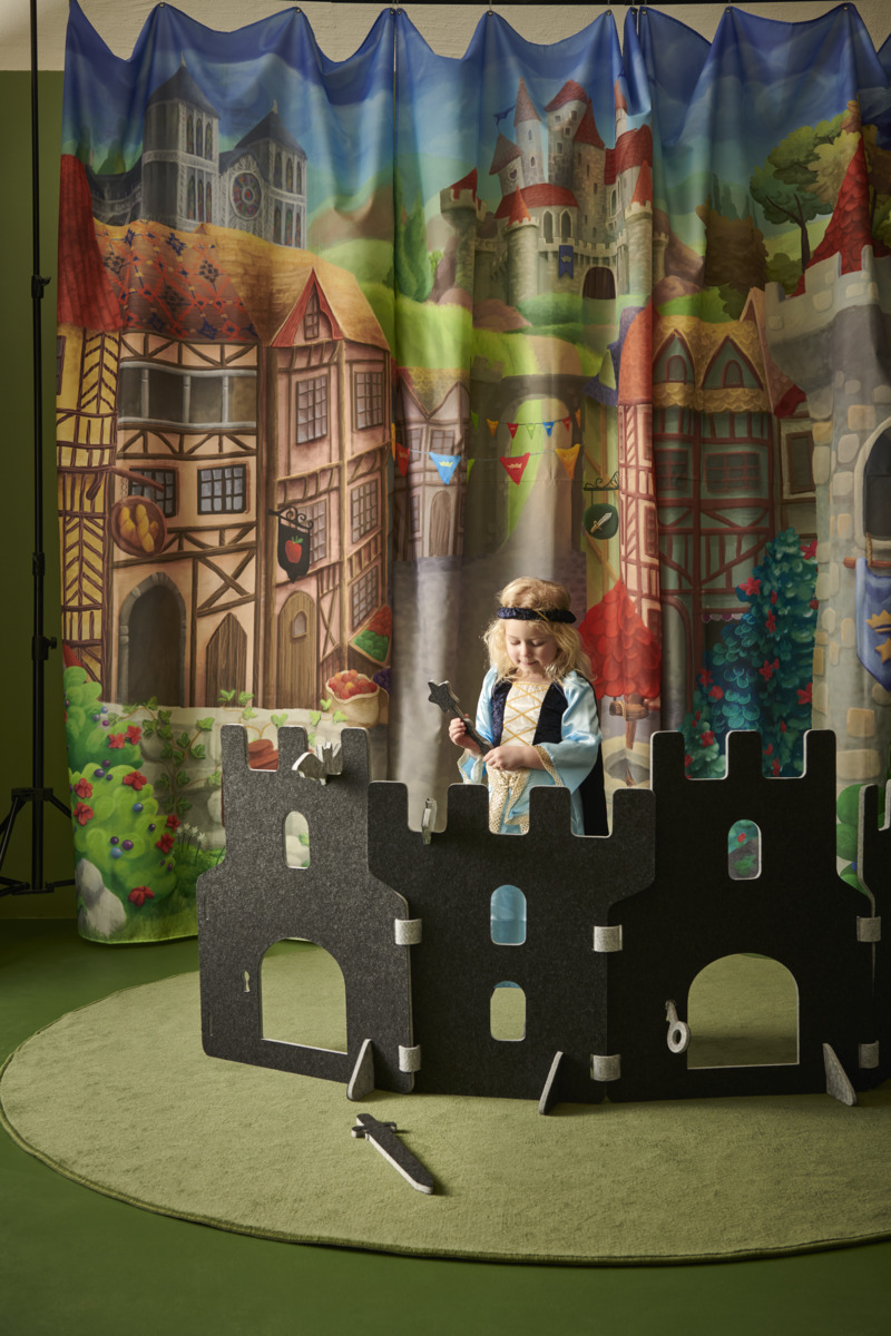 Legeskærme i lyddæmpende filt. Anvendes til scenografi, som rumdeler eller rekvisit i legen. Alle dele i Saga-serien kan bruges sammen. En kombination af by/huse med 4 skærme, 4 fødder og 6 hængsler. Fødder kommer i samme farvekombination som den valgte skærmfarve. Alle skærmene er lysegrå på den ene side. Hængsler er lysegrå. Mål på skærme: B58xH70 cm. Fremstillet af mindst 50 % genbrugsmateriale. 100 % genanvendelig.