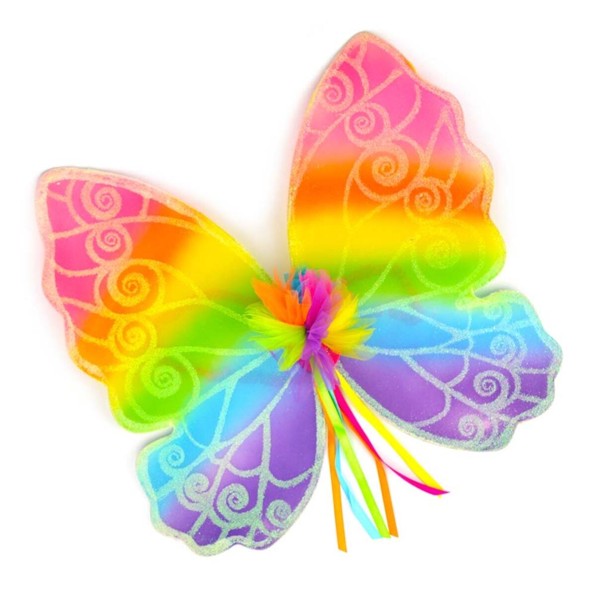 Vingerne er lette at tage på og behagelige at have på takket være de elastiske, satinklædte skulderstropper. Vingerne har alle regnbuens farver og er dekoreret med smukt sølvglitter. Bagpå er der også tylldetaljer med fine silkebånd. Af polyester og metal. PVC-fri. Fra 3 år.