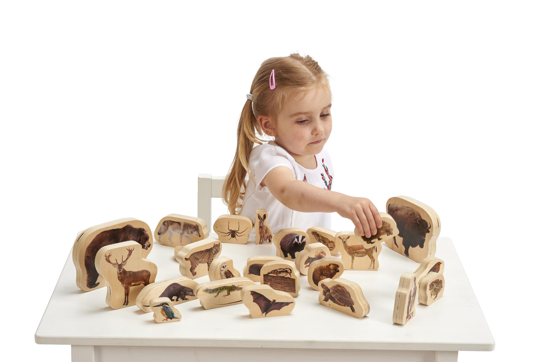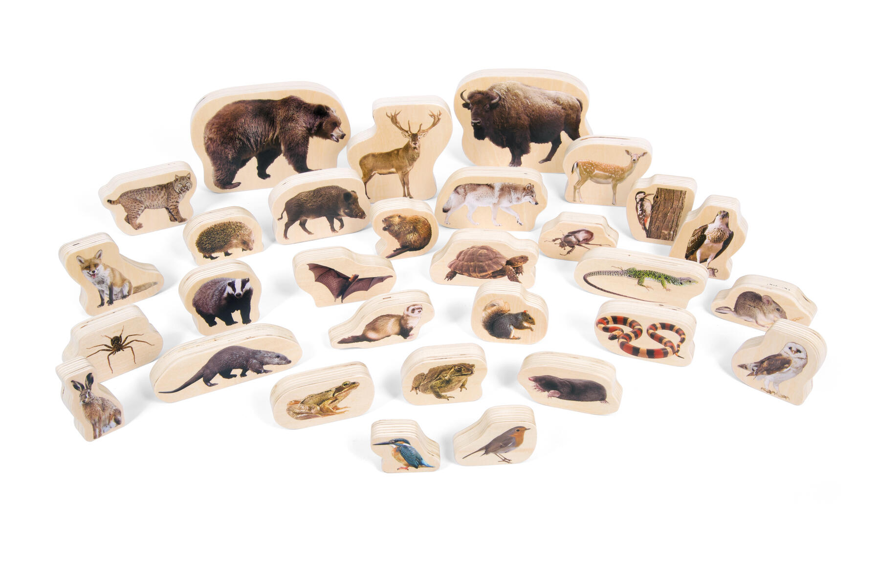 30 dele. Robuste træblokke med trykt motiv af skovens dyr på begge sider. Indeholder insekter, fugle, reptiler og pattedyr. Til rolleleg og til at udvikle sprogkundskaber. Fra 0 år.