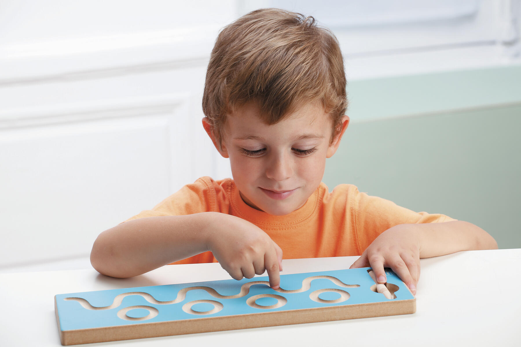 Kombinerer IKT, stimulansrespons og årsag og virkning med finmotorik sammen med et ønske om at udforske. Hver del kræver forskellige teknikker for at tænde lyset. Man kan trykke, skifte, dreje, trække eller skubbe for at få cirklen til at lyse. Kan monteres på væggen eller bruges på et gulv eller bord. Kræver 3 stk. AAA-batterier (sælges separat). Mål: 25x80x4 cm. Fra 10 måneder.
