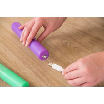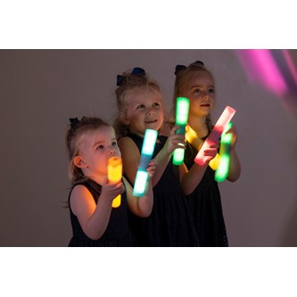 12 interaktive stave som lyser op, når man trykker på dem. Lær om årsagssammenhæng, og få respons på en bevægelse, når stavene lyser (de lyser i 3 minutter). Disse stave passer ind i mange forskellige aktiviteter såsom konstruktion, matematik, sensoriske øvelser og rolleleg. De kan bruges alene eller sammen med andre lysende produkter. I legen kan stavene forvandles til en telefon, en slange eller en raket. De er også sjove at danse med - måske i mørket - og sætte på et lysbord for at få forskellige effekter. 6 forskellige farver. 3-4 timers opladning giver 6-8 timers lysende leg. Oplades med USB-kabel. Mål: 21,2x3,3 cm. Fra 10 måneder.