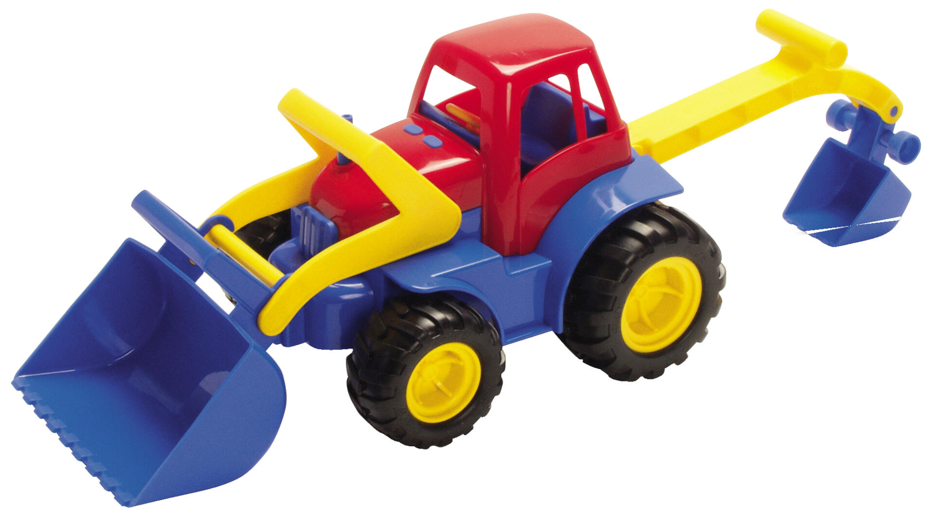 Traktorgraver af polyetenplast (PE), med gummihjul af termoplast (TPE). Svanemærket. Længde 51 cm. Fra 2 år. Samt en Traktor med anhænger. Længde 42 cm. Af polyeten og polypropen. Svanemærket. Fra 2 år.