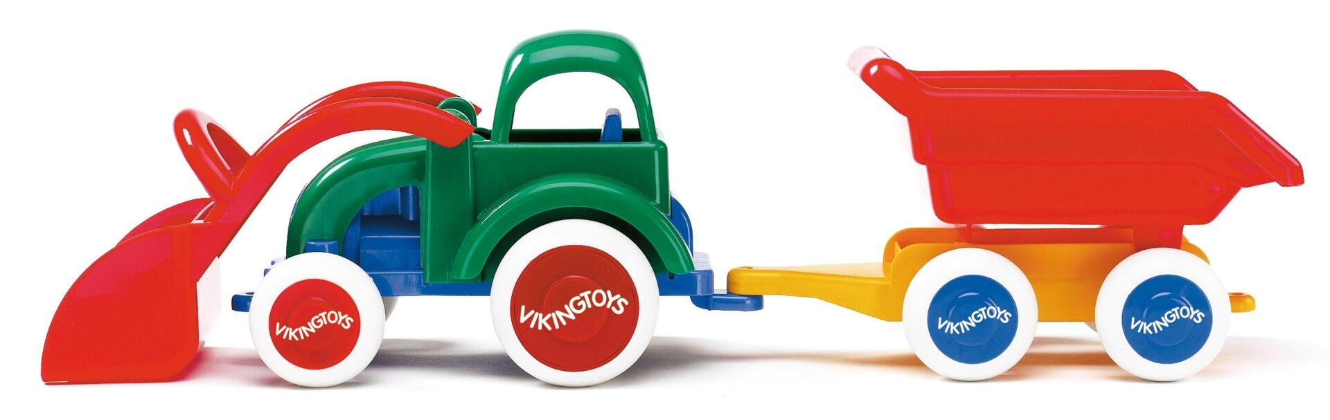 John Deeres toptraktor med en massiv tre-akslet dumper. De gummibelagte hjul har originale fælge. Traktoren har aftagelig motorhjelm, frontlæsser med skovl og anhænger. Bortset fra ganske små dele er den tre-akslede dumper lavet kun af metal. Målestok 1:87. Længde: 20 cm. Fremstillet af ABS, PP, PS og metal. Fra 3 år.