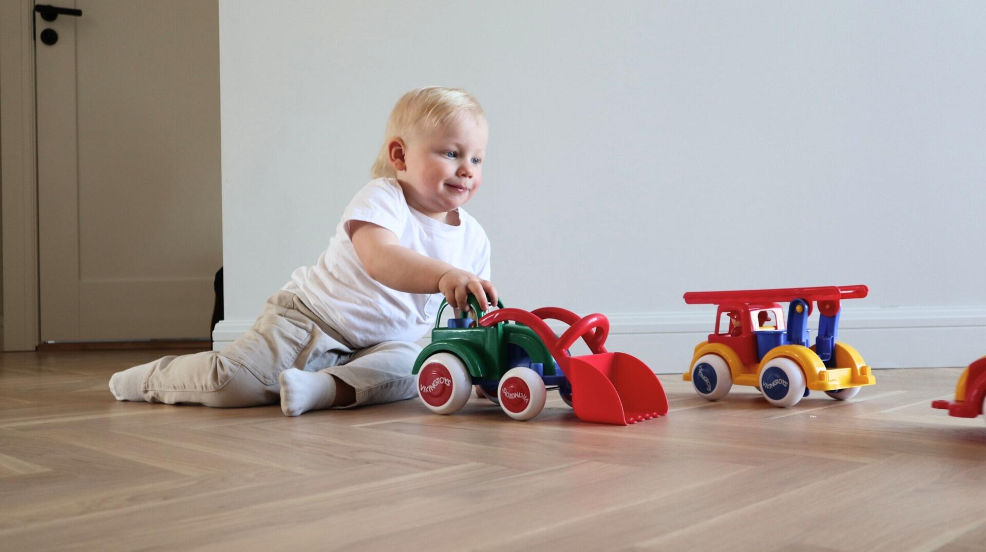 Jumbo-lastbil med hjul, der ruller mere lydsvagt. To figurer medfølger. Fremstillet af genanvendt PP. Leveres i assorterede farver. Tåler opvaskemaskine. PVC-fri. Fra 1 år.