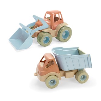 2 stk./pk. Traktor og lastbil som er fremstillet i bioplast. Bioplast består af 90 % sukkerrør, som er et bæredygtigt råmateriale. Plasten er derfor 100 % genanvendelig. Traktoren har en hæve-/sænkbar skovl og lastbilen et tiplad. Tåler frost. Længde ca. 30 cm. Svanemærket, licensnummer 50950001. Fra 2 år.