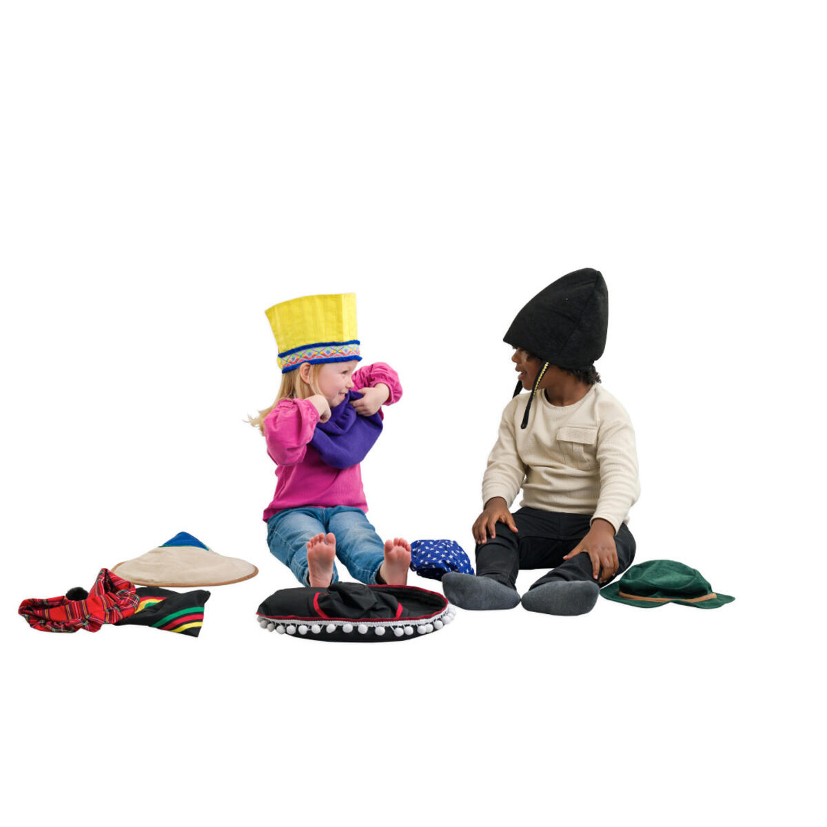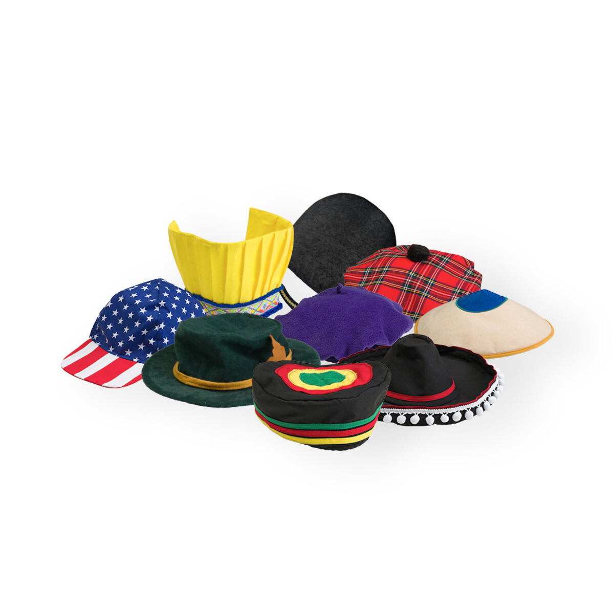 Leg og udforsk traditioner og kulturer fra hele verden. Indeholder 9 forskellige hatte: zuluhat, sombrero, rastahat, konisk hat, bonnethat, bjørneskindshat, kasket, baret og en struktureret hat. PVC-fri. Fremstillet af polyester. Fra 18 måneder.