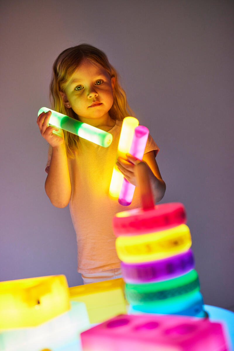 12 interaktive stave som lyser op, når man trykker på dem. Lær om årsagssammenhæng, og få respons på en bevægelse, når stavene lyser (de lyser i 3 minutter). Disse stave passer ind i mange forskellige aktiviteter såsom konstruktion, matematik, sensoriske øvelser og rolleleg. De kan bruges alene eller sammen med andre lysende produkter. I legen kan stavene forvandles til en telefon, en slange eller en raket. De er også sjove at danse med - måske i mørket - og sætte på et lysbord for at få forskellige effekter. 6 forskellige farver. 3-4 timers opladning giver 6-8 timers lysende leg. Oplades med USB-kabel. Mål: 21,2x3,3 cm. Fra 10 måneder.