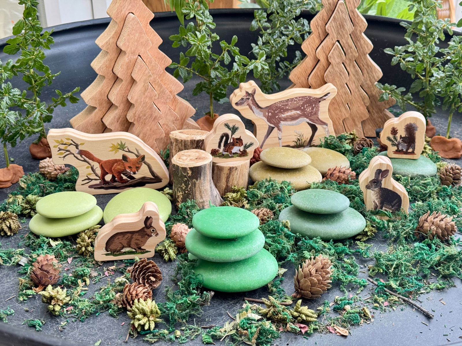 36 stk./pk. Sansesten i 12 forskellige farver, 3 størrelser af hver farve. Brug stenene til at tælle, sortere efter størrelse og farve og til at lave forskellige mønstre. Stenene har også en beroligende vægt og taktil overflade, som gør dem velegnede til sanselege. Velegnede både indendørs og udendørs. Mål: 5,5-8 cm. Materiale: sten. Fra 2 år.