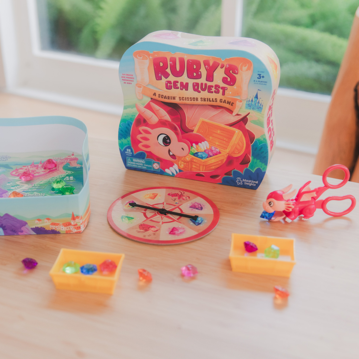 Drej for at starte din tur. Brug derefter Rubys sakseklo for at flyve over kongeriget og samle matchende farveperler. Den, der først får alle fem farver på ædelstene, vinder. Indeholder en sakseklo, 20 juveler, 1 spinner, 4 skattekister, en spilleplade samt instruktioner. 2-4 spillere. Fra 3 år.