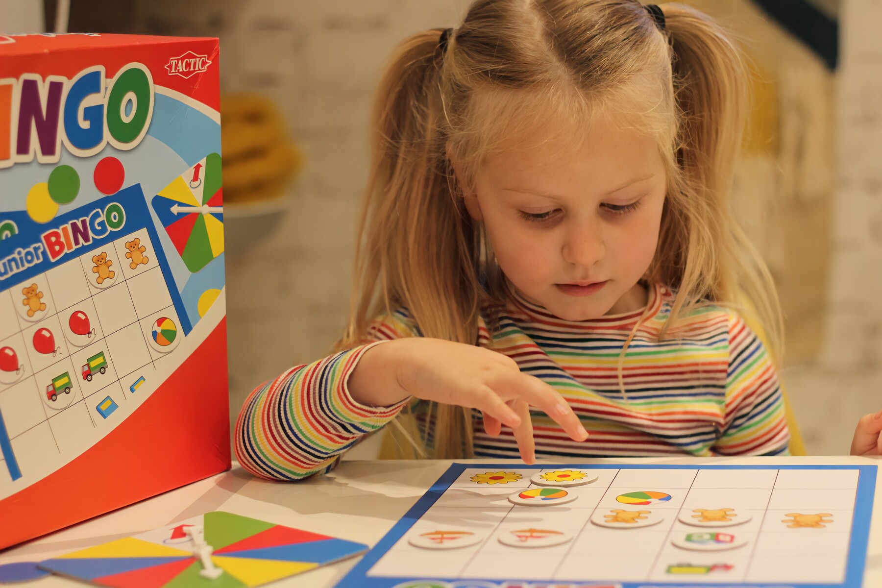 Et sjovt og farvestrålende spil til børn i alle aldre. Drej pilen, og forsøg at få fem billeder på stribe på bingopladen. Vinderen er den spiller, der først får bingo. Antal spillere: 2-6. Spilletid cirka 15 minutter. Af FSC-mærket karton. PVC-fri. Anbefales fra 4 år.