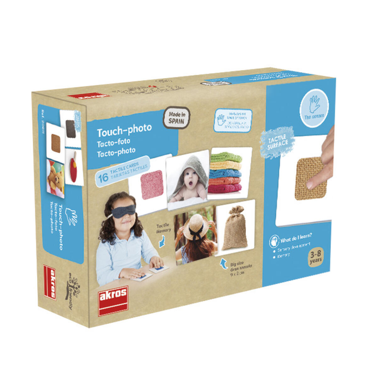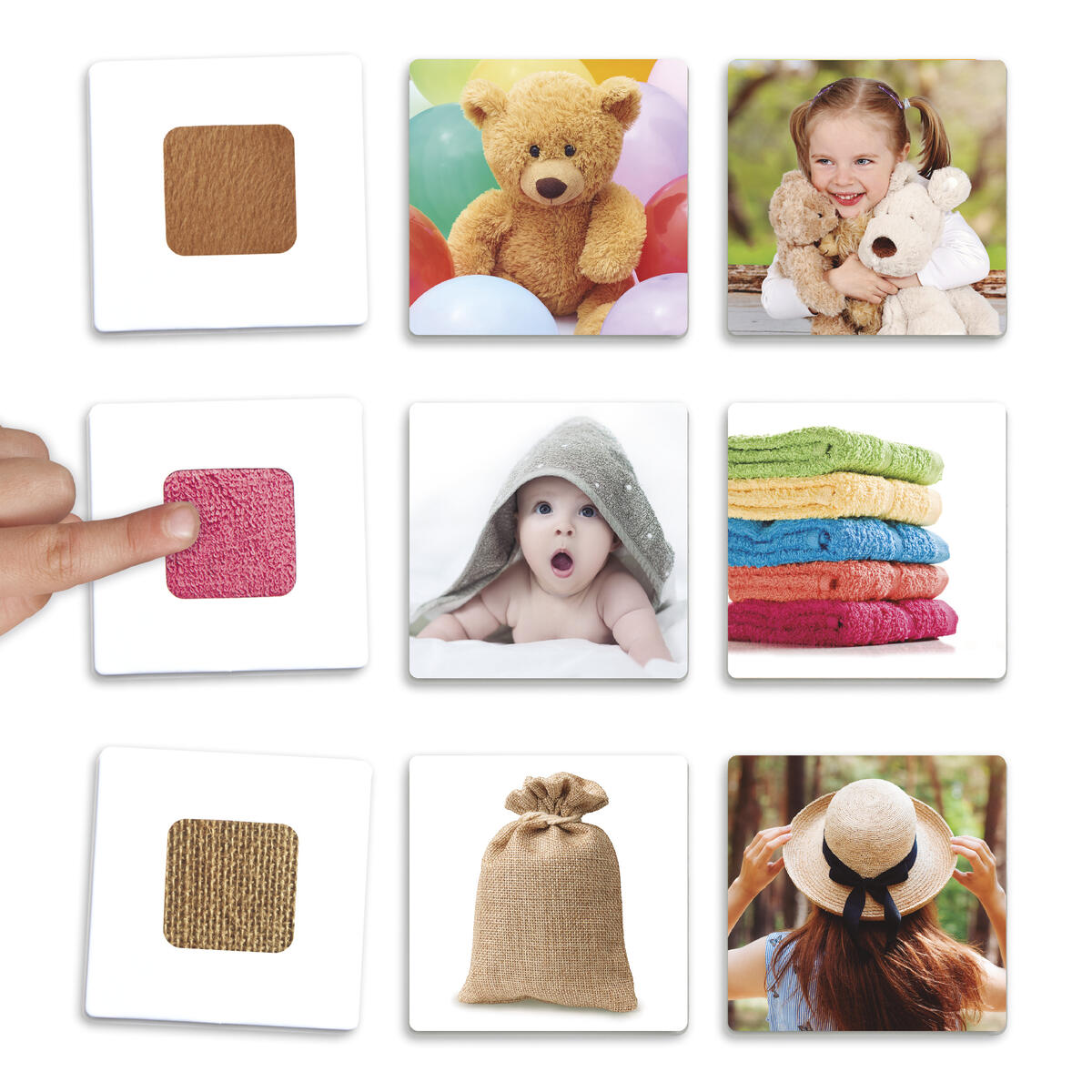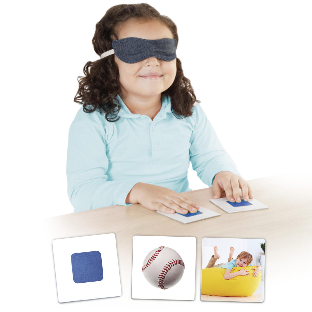 Et sansespil, som udvikler følesansen, ved at man mærker på 8 forskellige teksturer og kombinerer dem med de rigtige billeder. Indeholder 16 kort med taktil overflade (9x9 cm), 16 kort med billeder (9x9 cm) og to øjenbind. Fra 3 år.