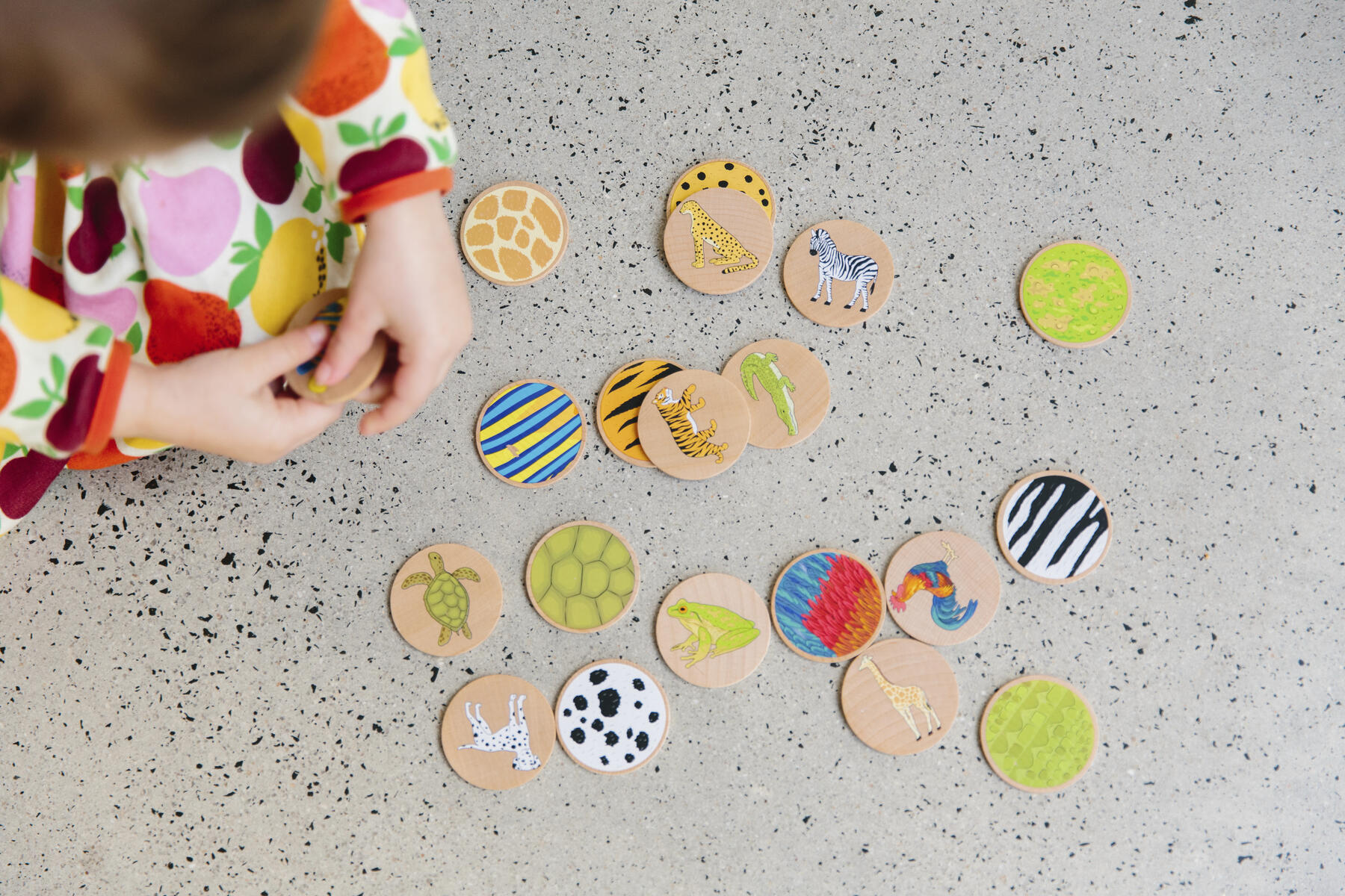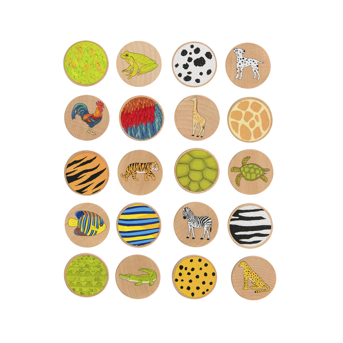 20 memobrikker opbevaret i en stofpose. Den ene brik viser et dyr, og den tilhørende brik viser et nærbillede af dyrets hud. Match f.eks. dalmatineren med pletterne, skildpadden med skjoldet eller zebraen med striberne. Motiverne er trykt med giftfri varmeoverføringsteknologi og forseglet med en klar lak. Fremstillet af FSC-certificeret træ. Ø5 cm. Fra 2 år.