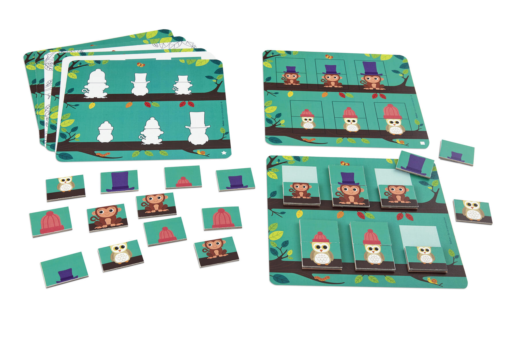 Et pædagogisk spil der træner børns observationsevne, logiske tankegang og rumlige bevidsthed, når de sorterer og placerer efter begreberne på, over, mellem, større end osv. Opgaverne på aktivitetskortene har stigende sværhedsgrad. Indeholder 2 magnetkort, 24 små magnetiske billedbrikker, 6 instruktionsbrikker og engelsk vejledning. Passer til 2 børn fra 3 år.