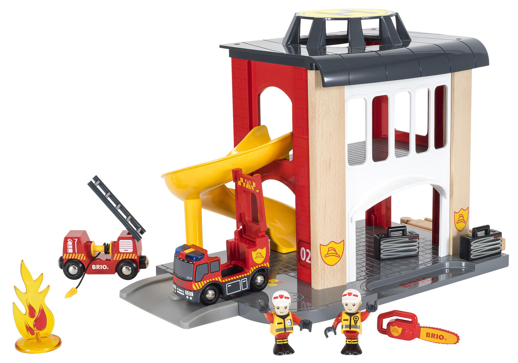 12 dele. Perfekt legetøj for børn, som drømmer om at slukke brande og redde liv. På brandstationen skal man være klar til udrykning. Når alarmen går, skal du tage rutsjebanen ned til brandbilen, som står klar til at køre. Indeholder bl.a. 2 brandbiler og 2 brandmænd. 2 stk. LR44-batterier medfølger. Af ABS-, PP- og TPR-plast. Mål: 27x18x23,6 cm. Fra 3 år.