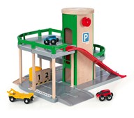 Lad tog- og bilbanen mødes i dette unikke parkeringshus. Tag liften op til øverste etage og parker, kør ned via vejen, eller fyld tanken på plan 1. Kobles til tog- og bilbane for enkel udbygning. Af FSC-certificeret bøg malet med vandbaseret maling. Mål: 37x27x27 cm. Fra 3 år.