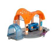 Hvert hjørne af kranen og tunnellen indbyder til nye opdagelser. En tunnel i flere etager med stor kran på toppen, som aktiverer fire forskellige lyde, når et tog kører igennem. Desuden kan den øvre del af bjerget tages af og placeres på togbanen. Kræver 2 stk. AA-batterier, som købes separat. Af FSC-certificeret bøg, vandbaseret farve og ABS. Mål: 45x27x24 cm. Fra 3 år.