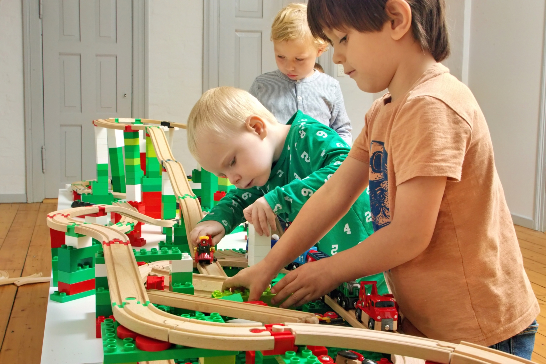 108 dele. Byggeklodser til kombination af plastklodser med togbaner i træ. Børnenes kreativitet udfordres, når de bygger i højden. Gør togbanen jævn og stabil, selvom opbygningen er kompleks. Indeholder 60 basiskontakter, 16 lige samlinger, 16 ankerkontakter, 8 dobbelthager, 4 dobbeltkontakter og 2 kryds. Byggeklodser og træskinner medfølger ikke. Af PLA-plast. Vaskes i hånden. Fra 3 år.