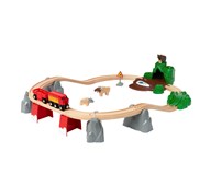 Indeholder 21 dele: 2 bropiller der kan stables, 2 ramper, 2 buede sporskifter, 1 drejeskive, 1 T-kryds, 2 korte sporskifter, 2 opfartsskinner, 2 stopbomme, 2 svingkryds, 1 krydsskinne og 4 lige skinner. Af FSC-certificeret bøgetræ og vandbaseret maling. Fra 3 år.