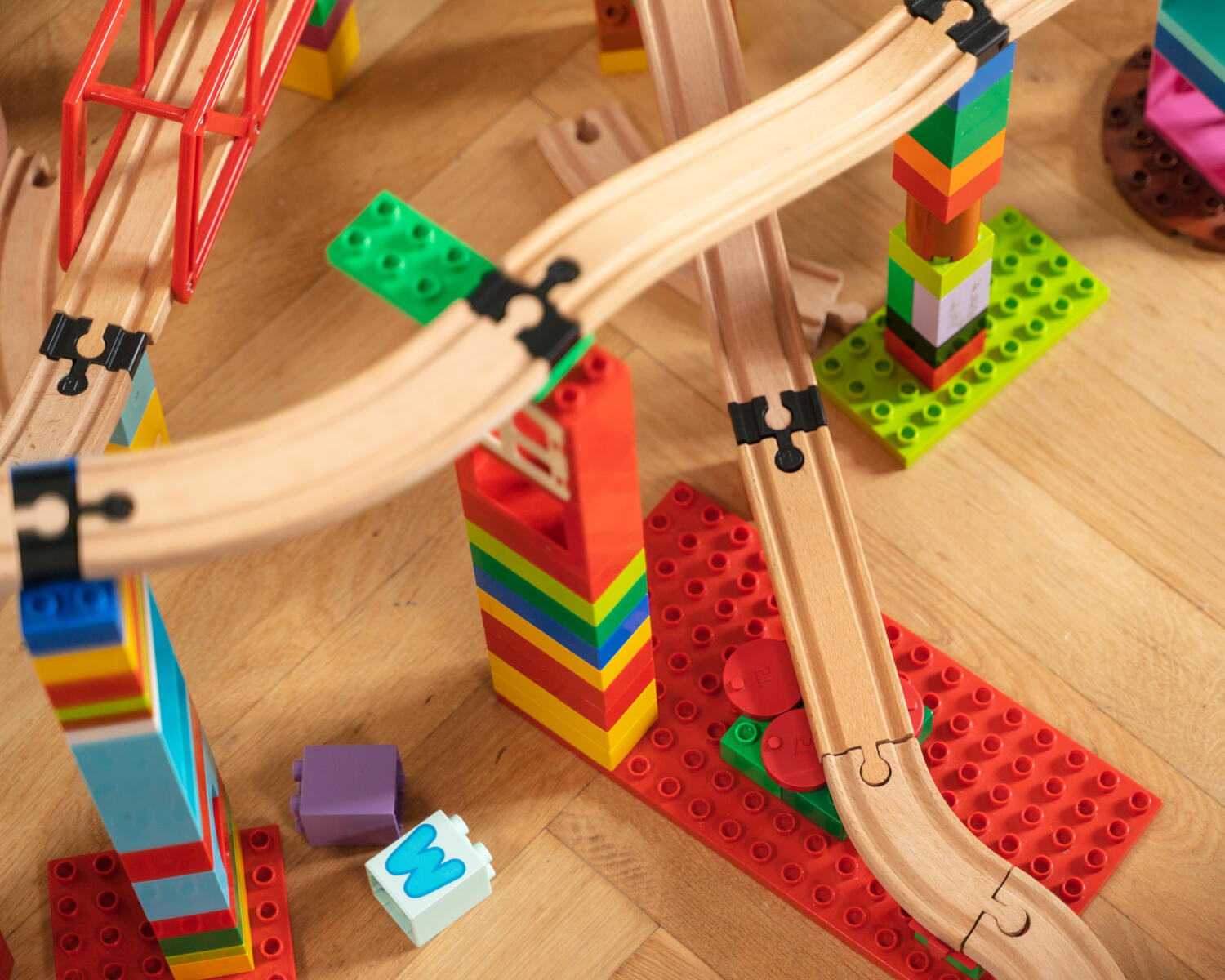 44 dele. Byggeklodser til kombination af plastklodser med togbaner i træ. Børnenes kreativitet udfordres, når de bygger i højden. Gør togbanen jævn og stabil, selvom opbygningen er kompleks. Indeholder 28 basiskontakter 4 ankerkontakter, 6 dobbelthager, 4 dobbeltsamlinger og 2 kryds. Byggeklodser og træskinner medfølger ikke. Af PLA-plast. Vaskes i hånden. Fra 3 år.