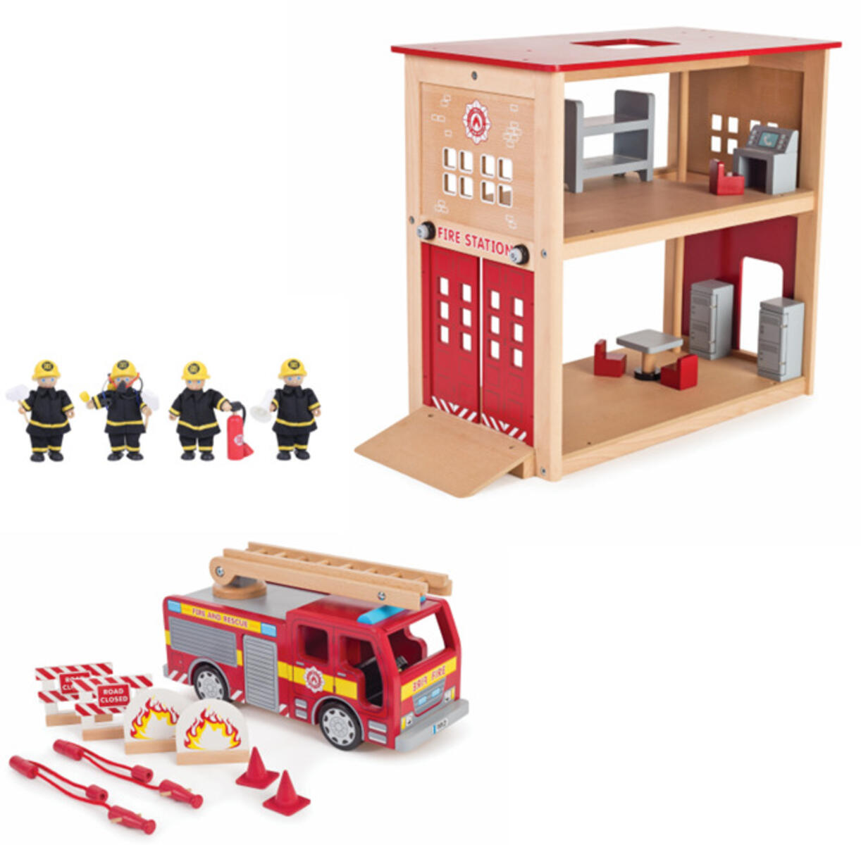 Et komplet sæt med brandstation i 2 etager med møbler, brandbil med udtrækkelig stige, som kan rejses og drejes rundt, samt brandmænd med bøjelige arme og ben. Af træ, brandstation og brandbil af FSC-certificeret træ. PVC-fri. Fra 3 år.