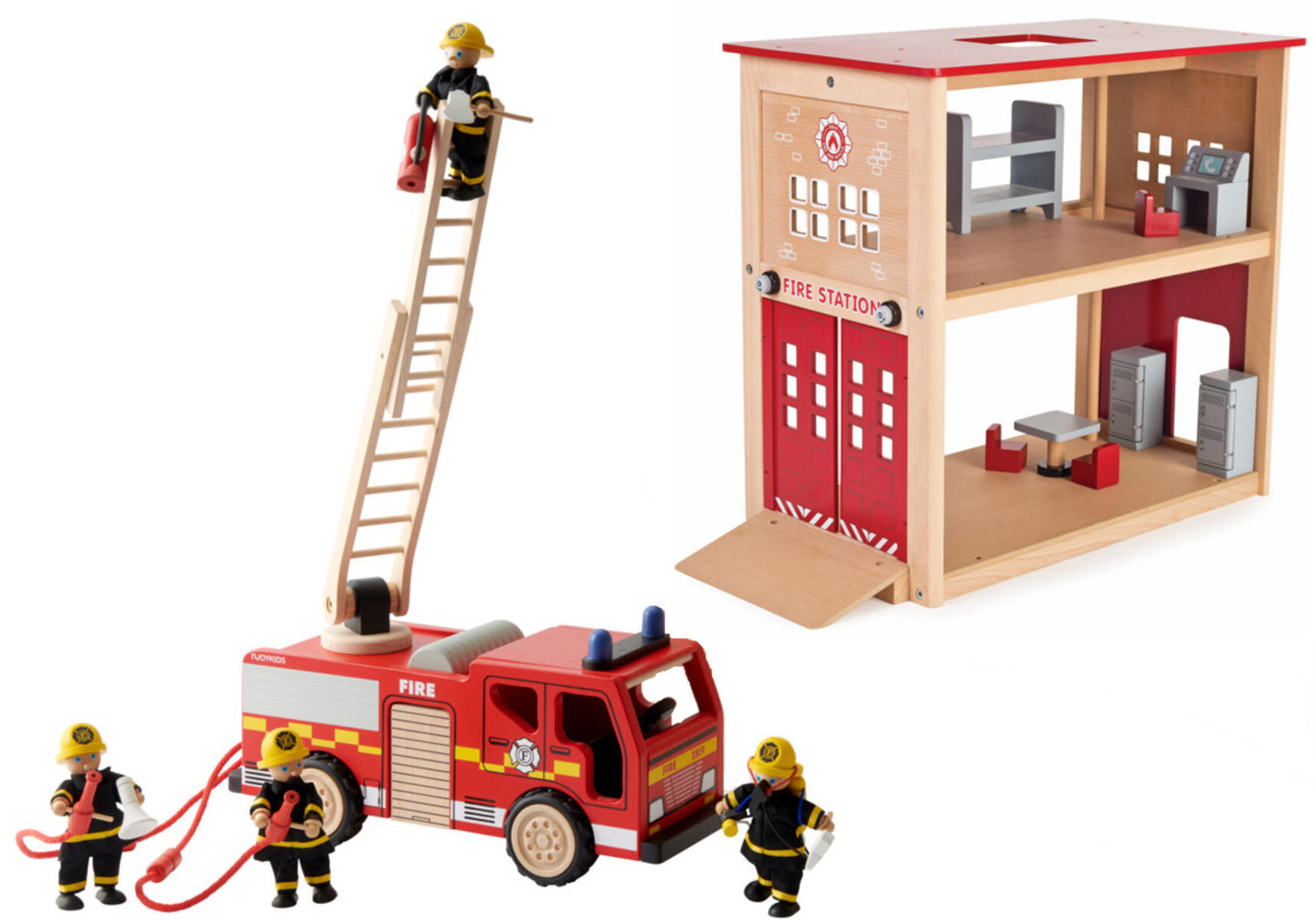 En stor brandbil med aftageligt lad, hvor man kan opbevare brandslangerne. Stigen kan trækkes ud og vendes rundt. Taget kan løftes af og give plads til brandmændene. Af træ. Fra 3 år.