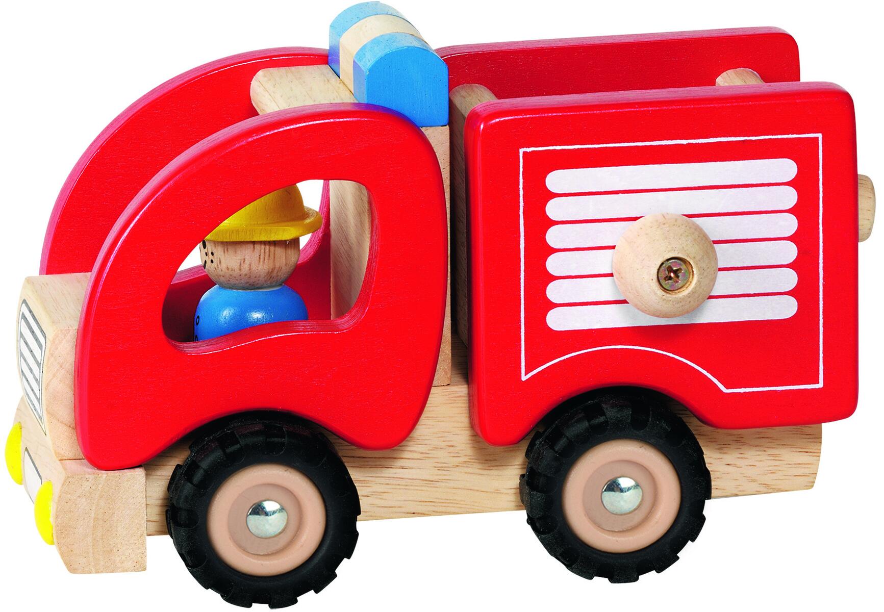 Skraldebil med en legefigur. Bilen har gummihjul, hvilket gør legen mere støjsvag. Mål: 13x10x7 cm. Af FSC-mærket træ og gummi. PVC-fri. Fra 18 måneder.