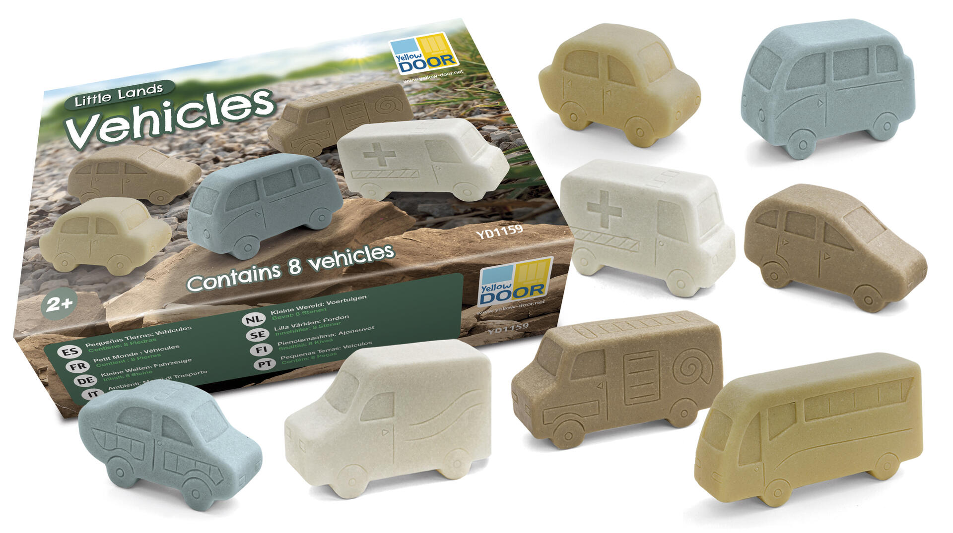 8 stk./pk. Køretøjer af sten som holder til al slags vejr. Perfekt til små hænder og med gravering, der viser køretøjets funktion. Sættet består af: ambulance, autocamper, turistbus, stationcar, brandbil, politibil, lille bil og varevogn. Det største køretøj er 8 cm. Fra 2 år.