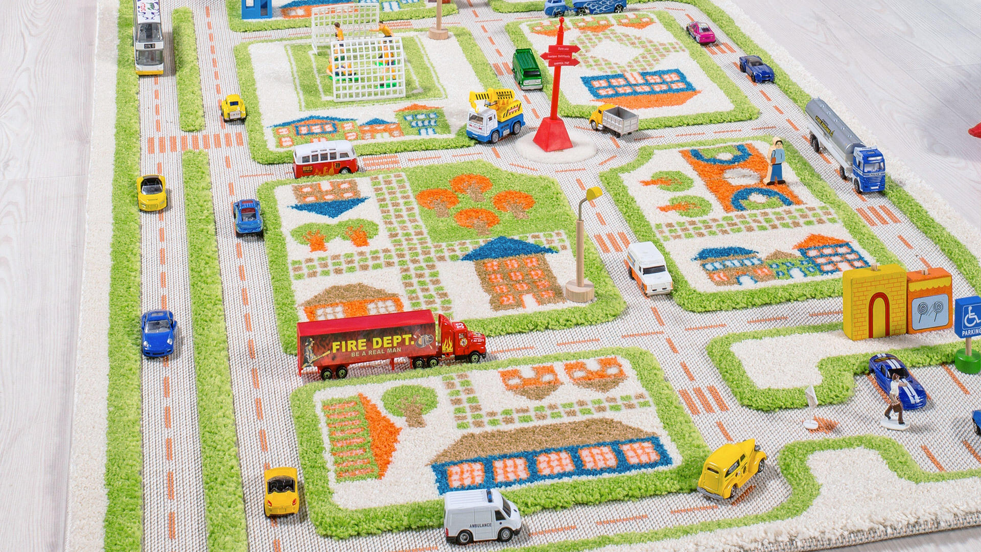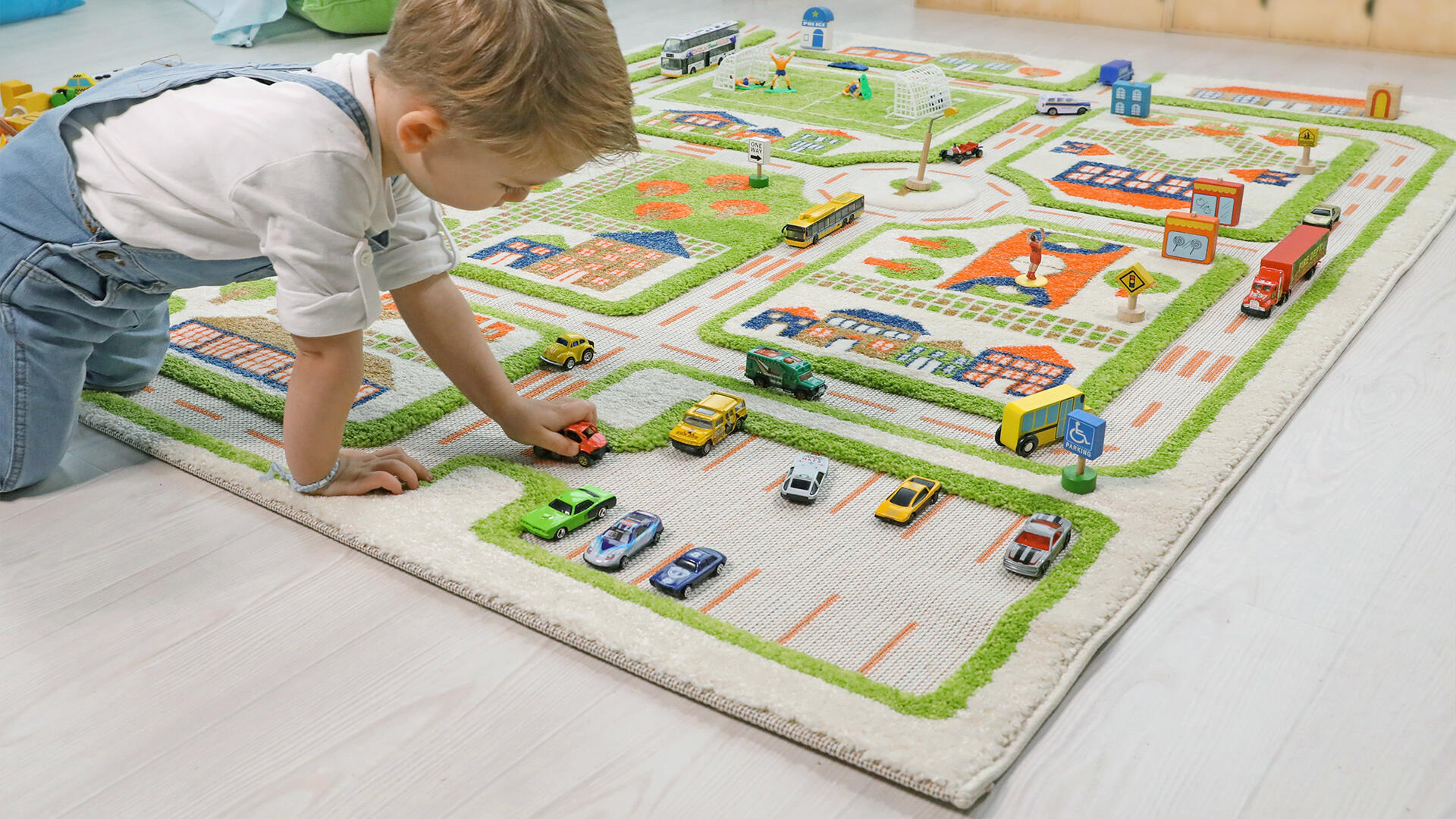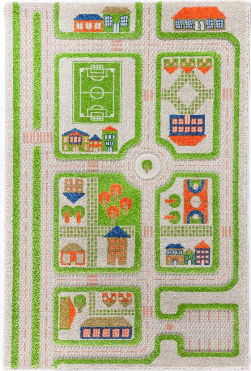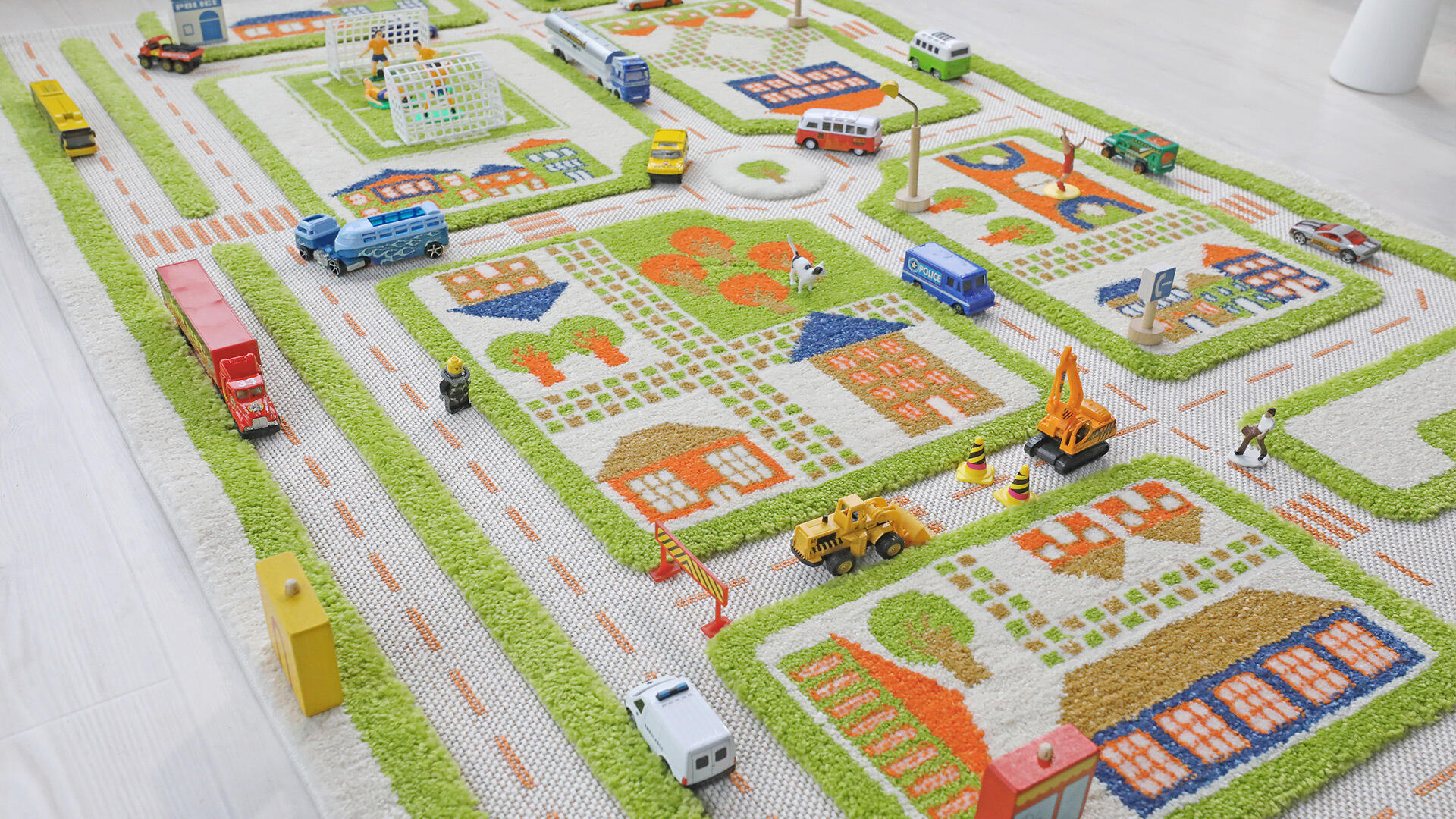 Et stort tæppe med plads til meget transportkørsel. Flere børn kan lege på tæppet samtidig. Kan støvsuges. Pletter fjernes med mildt rengøringsmiddel og en blød klud. . Tæppet har latex-underside, som gør det skridsikkert.