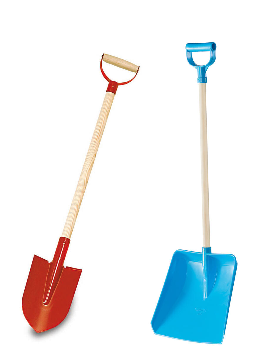 2 dele. 1 sneskovl i HDPE-plast med træskaft. Leveres i ass. farver. Sneskovl mål: 79cm. 1 junior spade med metalblad og skaft af træ. Spade mål: ca.70cm.