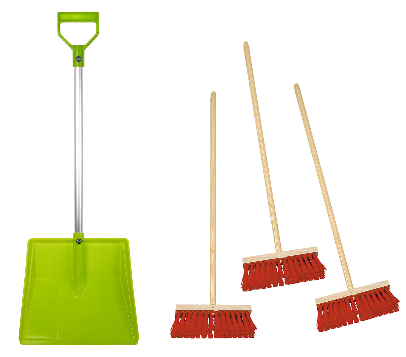 2 dele. 1 sneskovl i HDPE-plast med træskaft. Leveres i ass. farver. Sneskovl mål: 79cm. 1 stor sneskovl kraftigt skaft af aluminium og blad af polyeten. Sneskovl mål: 71x26cm.