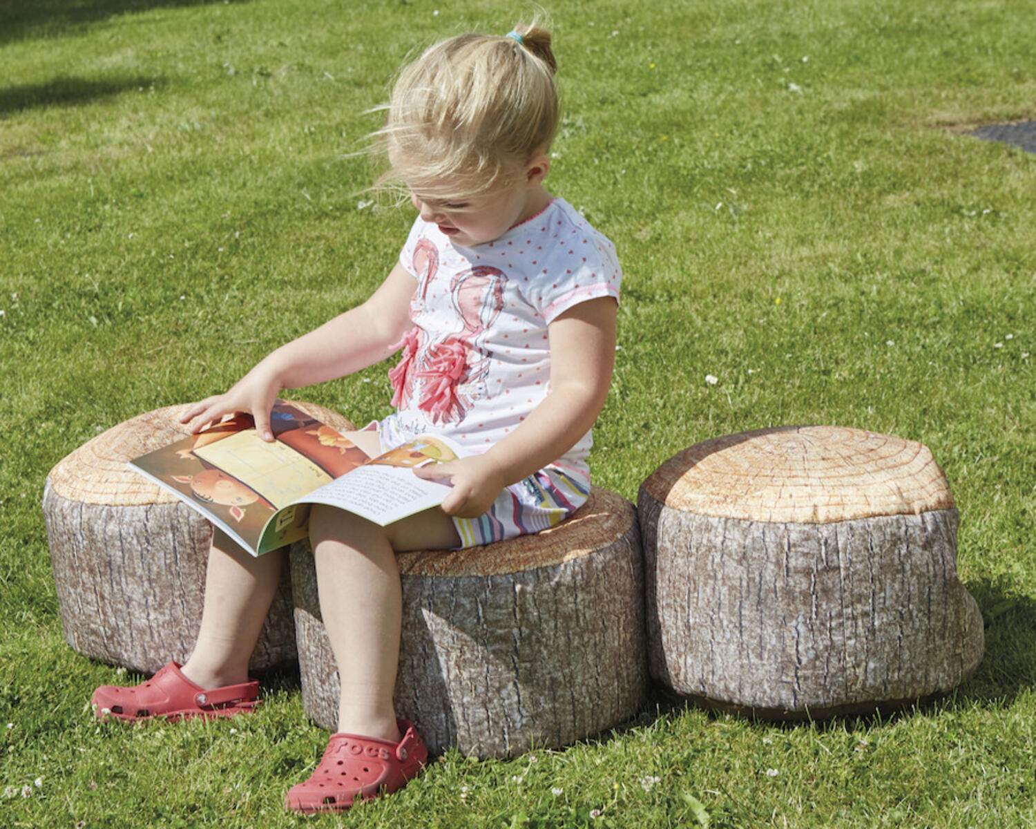 3 stk./pk. Sækkestole i form af træstubbe med barktryk, som er designet til at understøtte et udendørs klasselokale (de bør ikke efterlades ude natten over). Stabelbare for nem opbevaring. Vandtætte og lette at rengøre med en fugtig klud. Af polyester. Mål: H20 cm x Ø38 cm.