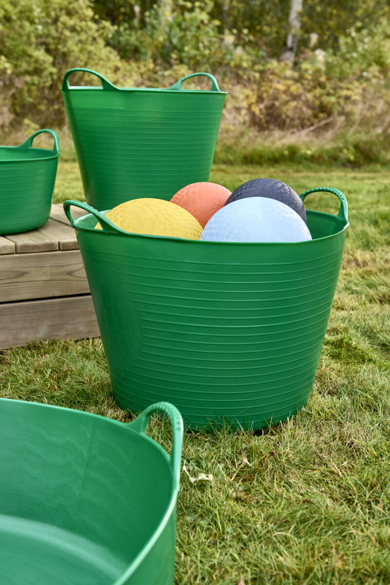 Alsidig opbevaringskurv til udemiljøet. Den robuste og fleksible kurv kan bruges til mange forskellige aktiviteter: Saml naturmaterialer, anvend den til plantning og dyrkning eller leg og eksperimentér med vand, jord, grus og sand – og skyl den nemt ren igen. Fremstillet af genanvendt, UV-bestandig, frostsikker og fødevaregodkendt LDPE-plast.