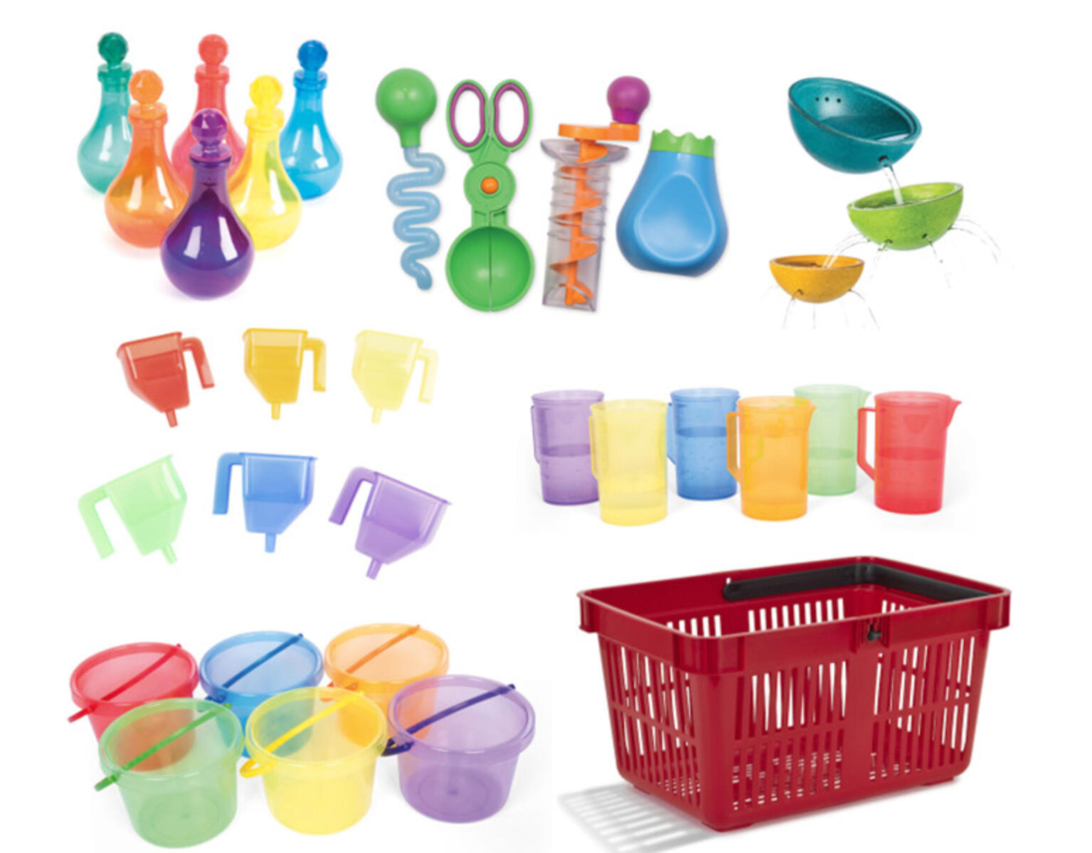 30 dele. Et sæt som er sammensat i samarbejde med pædagoger for at gøre det nemt at flytte vandlegen udendørs. Indeholder: 13618 Sæt til sand- og vandleg (4 dele), 13602 fontæneskåle (3 dele), 13620 bægre (6 dele), 13621 spande 1,5 liter (6 dele), 13125 magiske plastflasker (6 dele),13619 tragt (1 stk.), 58258 glittercylinder (3 dele) og 124579-12 opbevaringskurv 27 liter. Vogn til kurv (124580) kan tilkøbes.