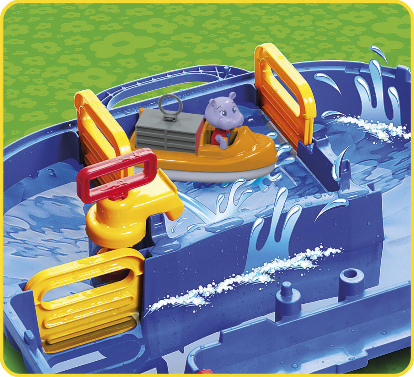 44 dele. Et sjovt kanalsystem til eksperimenter med vand. Sæt bådene i bevægelse, lad vandet stige i slusen, og sæt farten op henover bakken fra bjerget. Sættet indeholder båd og 3 dyrefigurer. Sammen med figurerne kan børnene udforske bjergets mystiske grotte, klatre op ad klipperne, tage båden ned ad vandfaldet eller lede efter skatte i kanalerne. Dette er en kreativ og sjov måde, hvorpå man kan finde ud af, hvordan vand bevæger sig, og mange børn kan lege samtidig. Mål: 126x88x35 cm. Af polypropenplast. PVC-fri. Fra 3 år.