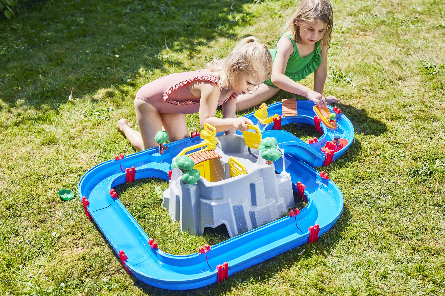 44 dele. Et sjovt kanalsystem til eksperimenter med vand. Sæt bådene i bevægelse, lad vandet stige i slusen, og sæt farten op henover bakken fra bjerget. Sættet indeholder båd og 3 dyrefigurer. Sammen med figurerne kan børnene udforske bjergets mystiske grotte, klatre op ad klipperne, tage båden ned ad vandfaldet eller lede efter skatte i kanalerne. Dette er en kreativ og sjov måde, hvorpå man kan finde ud af, hvordan vand bevæger sig, og mange børn kan lege samtidig. Mål: 126x88x35 cm. Af polypropenplast. PVC-fri. Fra 3 år.