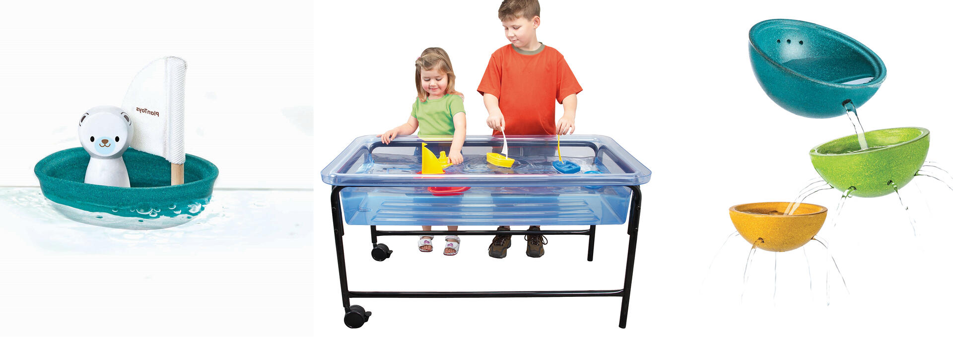 3 forskellige skåle med huller, som kan bruges til at eksperimentere med vand. Fremstillet af gummitræ. Malet med økologisk, vandbaseret og giftfri farve. Skåle mål: 13x13x6 cm. 2 sejlbåde med tilhørende isbjørn og pingvin, klar til sjove sejlture. Lavet af genplantet gummitræ og malet med økologisk vandbaseret giftfri maling. Sejlbåd mål: 12cm Fra 1 år. 1 vandlegebord i gennemsigtig plast. Bordet har afløbsbane i bunden, og stativet har 2 hjul, som gør det let at flytte rundt. Karrets mål: 110 x 60,5 cm, dybde 21,5 cm. Stativets højde 58 cm.