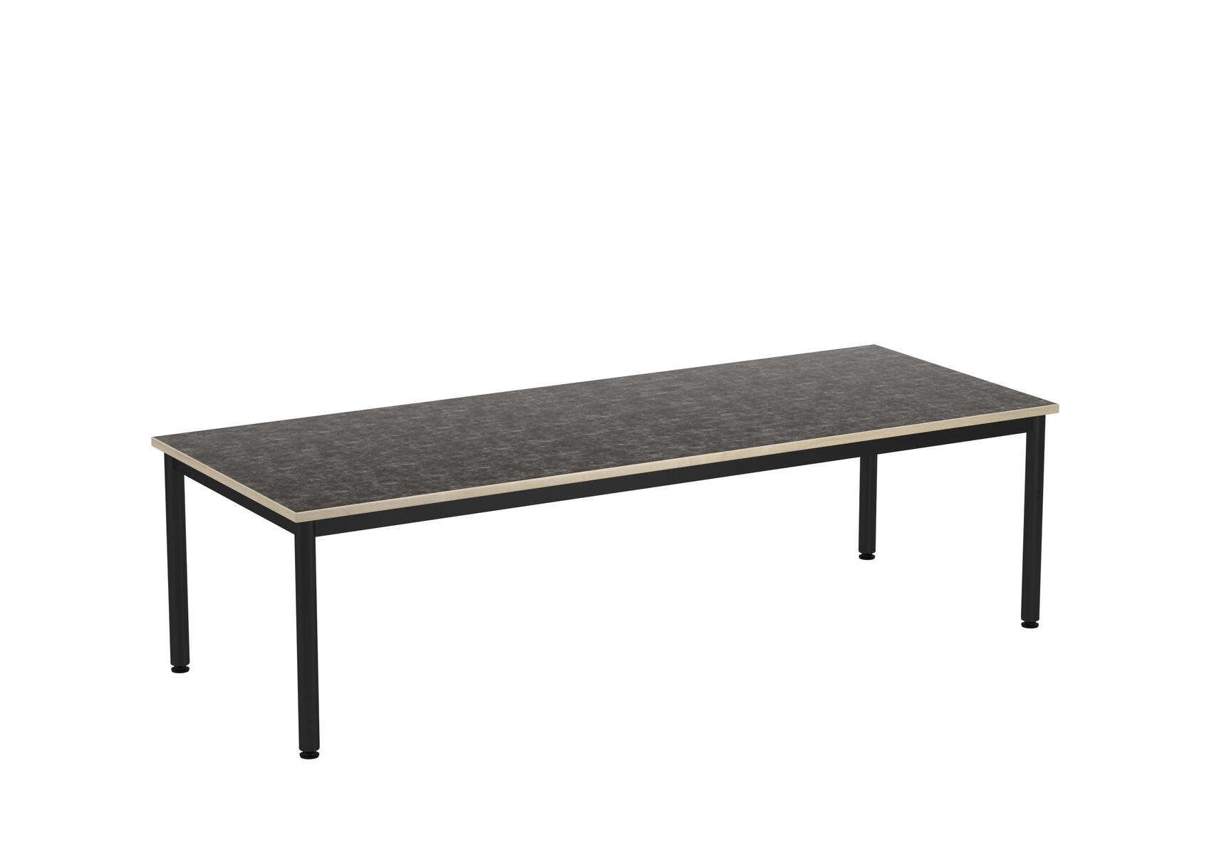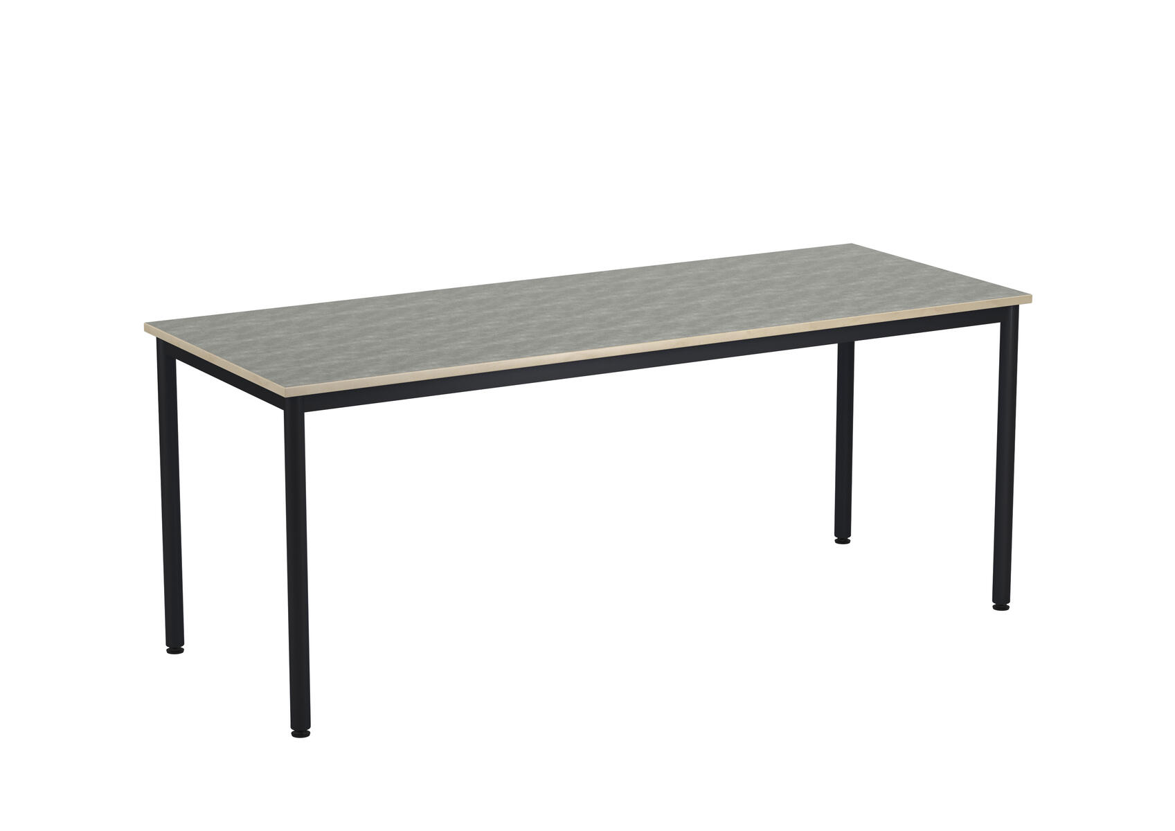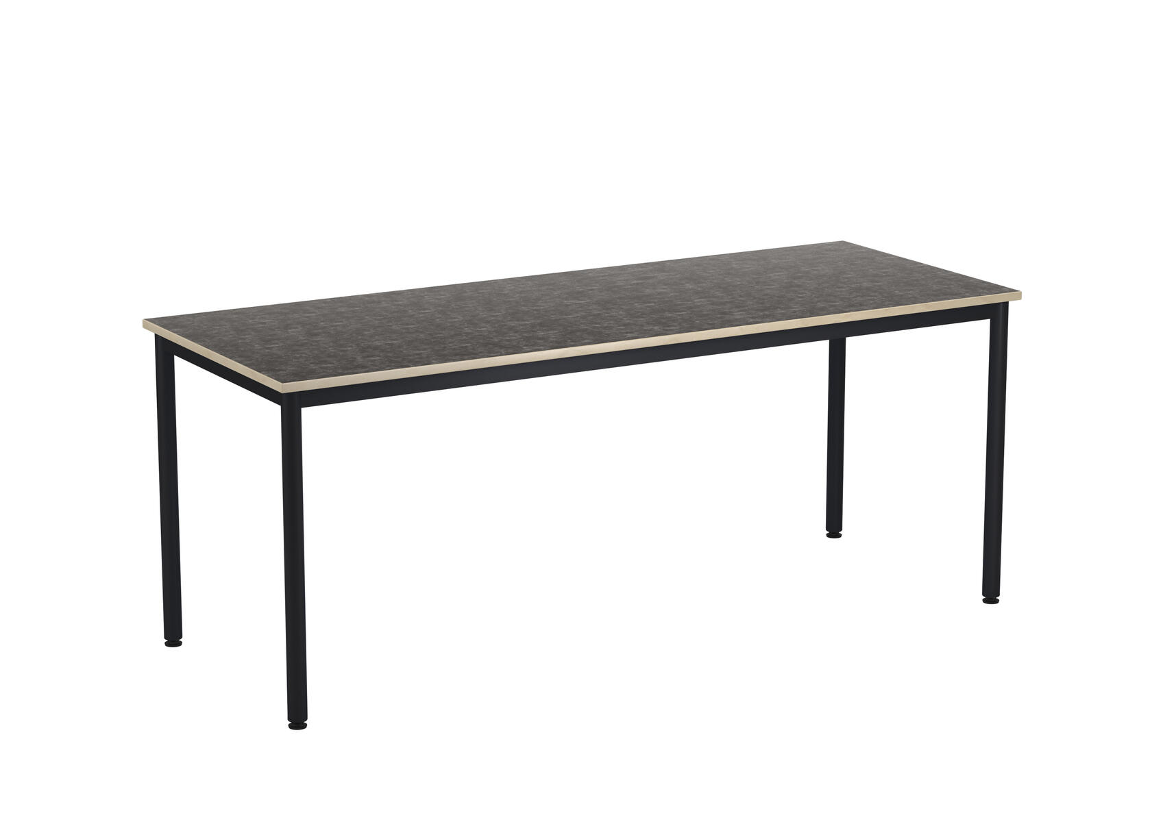 Bordplade med lyddæmpende overflade i linoleum. Justerbare stilleskruer sikrer, at bordet står stabilt selv på ujævne overflader. Understel i sort RAL 9005.