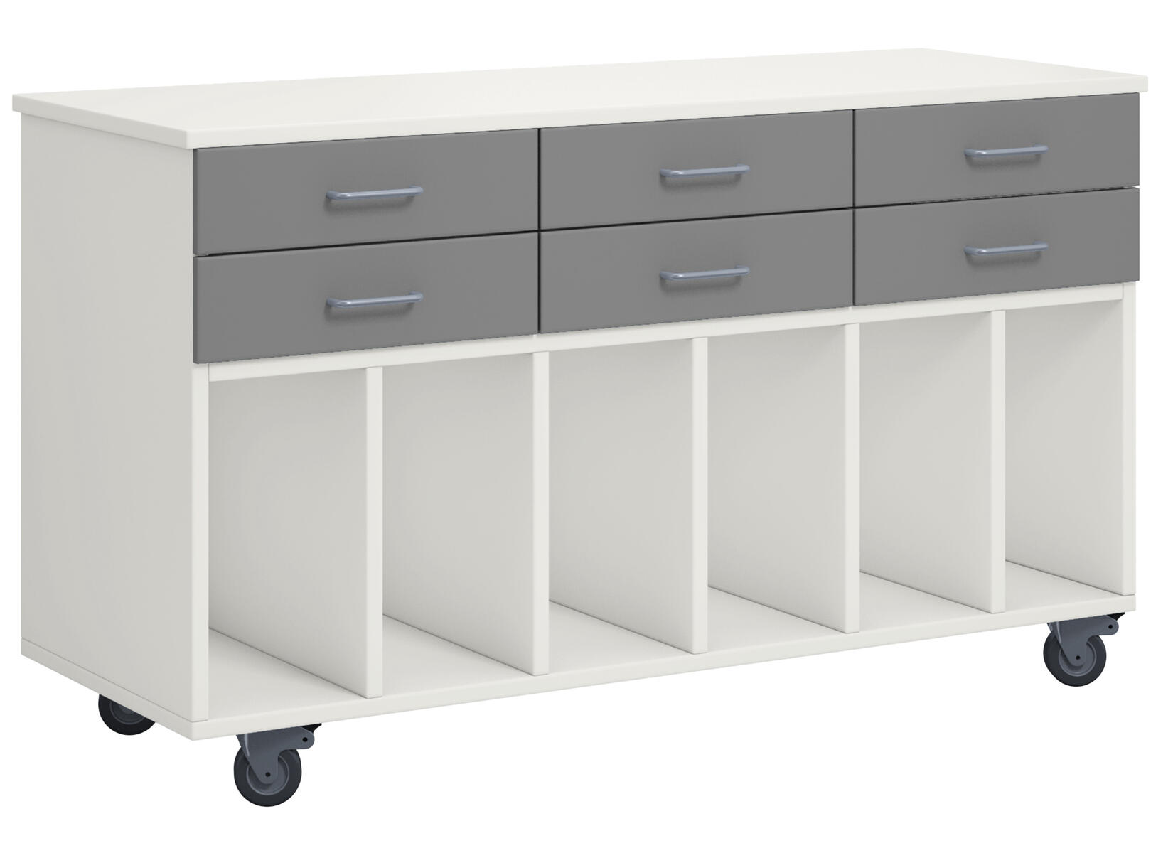 Elevreol i decor laminat. Med 6 skuffer og 6 rum. Skuffefronter fås i decor laminat eller højtrykslaminat. Kompletteres med sokkel eller hjulplade. Kan også kompletteres med døre (varenr. 80685).