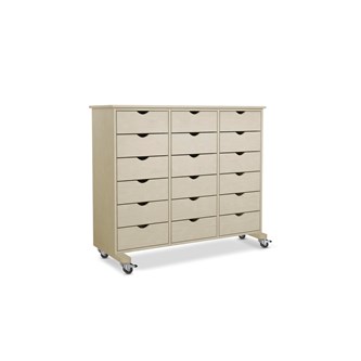 Købmandsdisk/kommode med 18 store skuffer på udtræksskinner og korpus i 18 mm hvidpigmenteret birkekrydsfinér. Leveres med 5 låsbare hjul, hvoraf 4 er på støtteben. Kan bruges som rumdeler. Skuffens indvendige mål B30xD32xH9,5 cm. Mål: 113x37x100 cm. Støttebenet stikker ca. 7 cm ud. Mobile enheder giver øget fleksibilitet og mulighed for at forandre rummets møblering. Vi vil dog gøre opmærksom på, at hylder og sektioner på hjul giver en øget risiko for at tippe, specielt hvis de placeres frit på gulvet. Undgå at placere tunge genstande højt oppe og lad ikke børn flytte på købmandsdisken. Mobile enheder med en højde på over 1 m anbefaler vi at placere mod en væg.