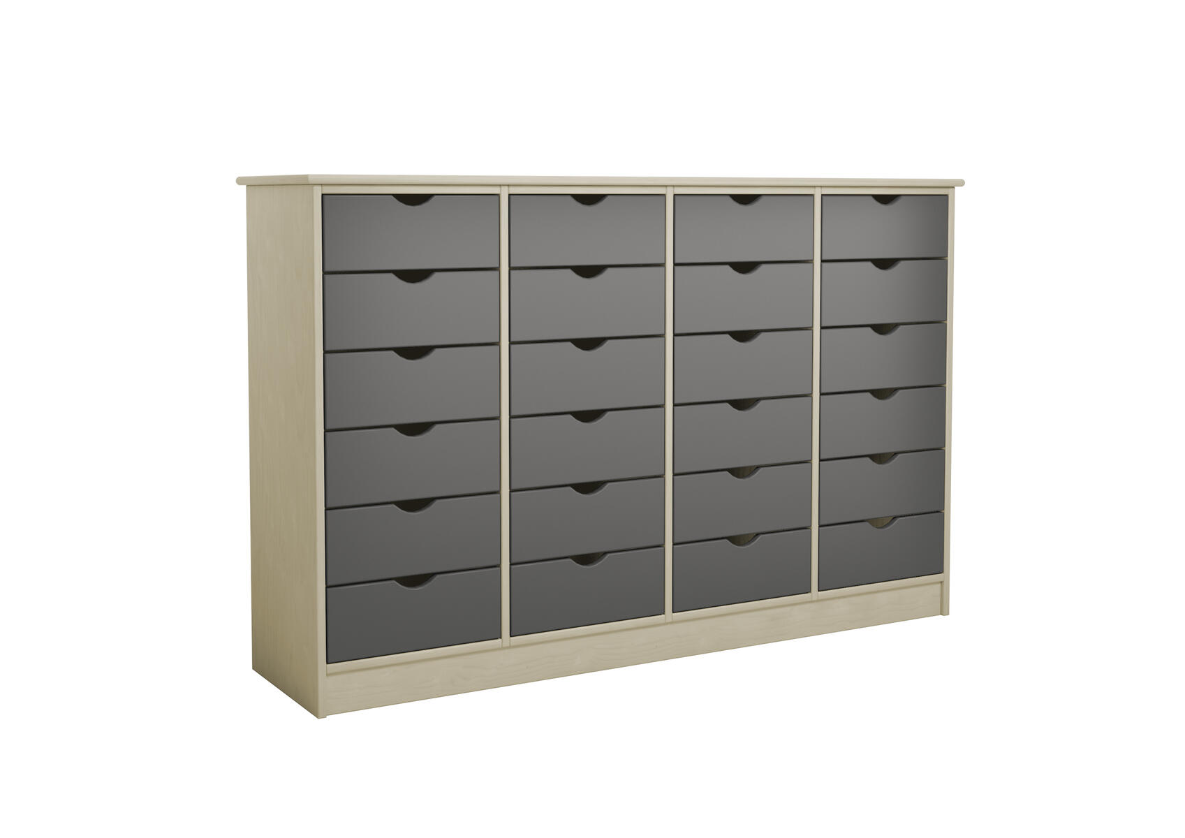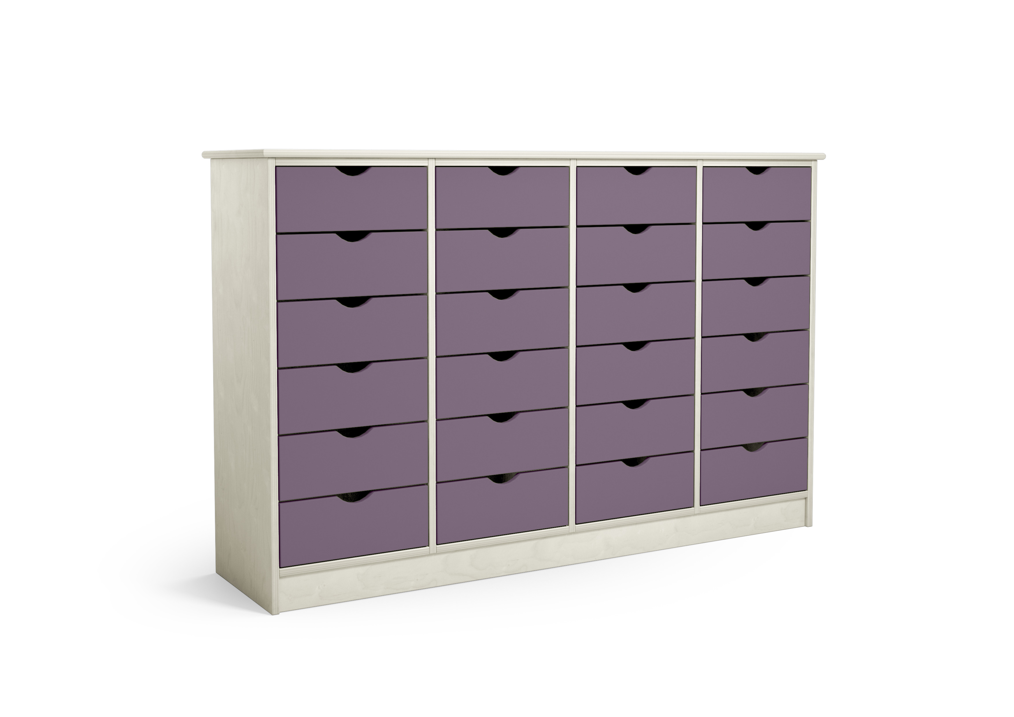 Købmandsdisk/kommode med 24 store skuffer på udtræksskinner og sokkel. Korpus i 18 mm klarlakeret birkekrydsfinér. Kan bruges som rumdeler. Skuffens indvendige mål: B30xD32xH9,5 cm. Mål: 150x37x98 cm. Vælg mellem forskellige farver på skuffefronterne, når du vælger variant nedenfor. Leveres med vinkelbeslag for fastgørelse til væggen.