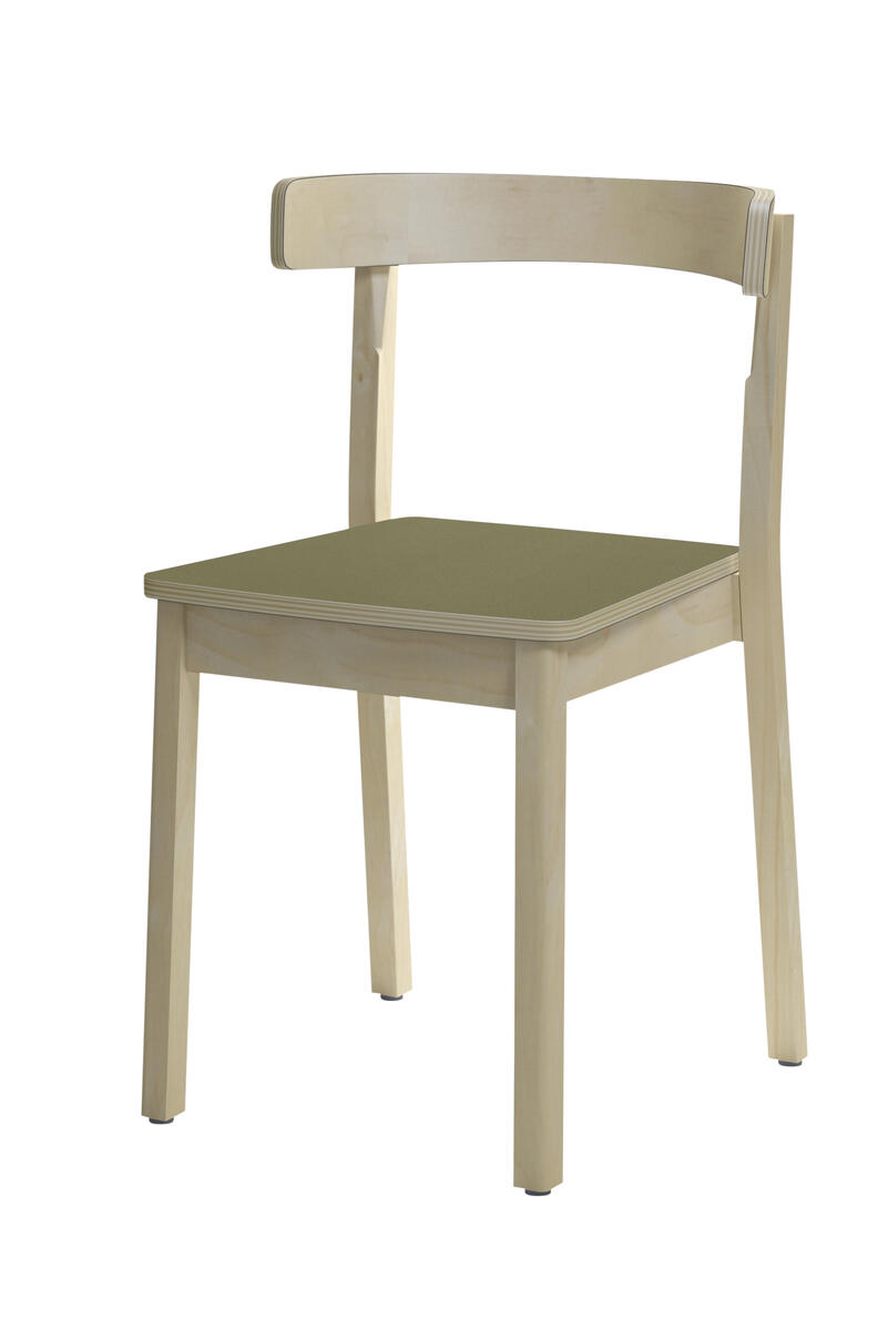 Massiv birk. Formpresset sæde og ryg. Højtrykslaminat på sæde. Med lyddæmpning under sæde. Kan stables og hænges på bordet. Siddehøjde 45 cm. Siddedybde 41 cm.
