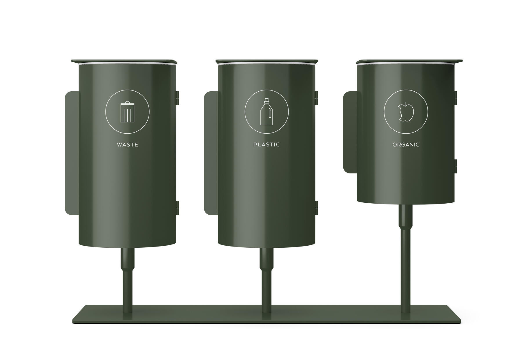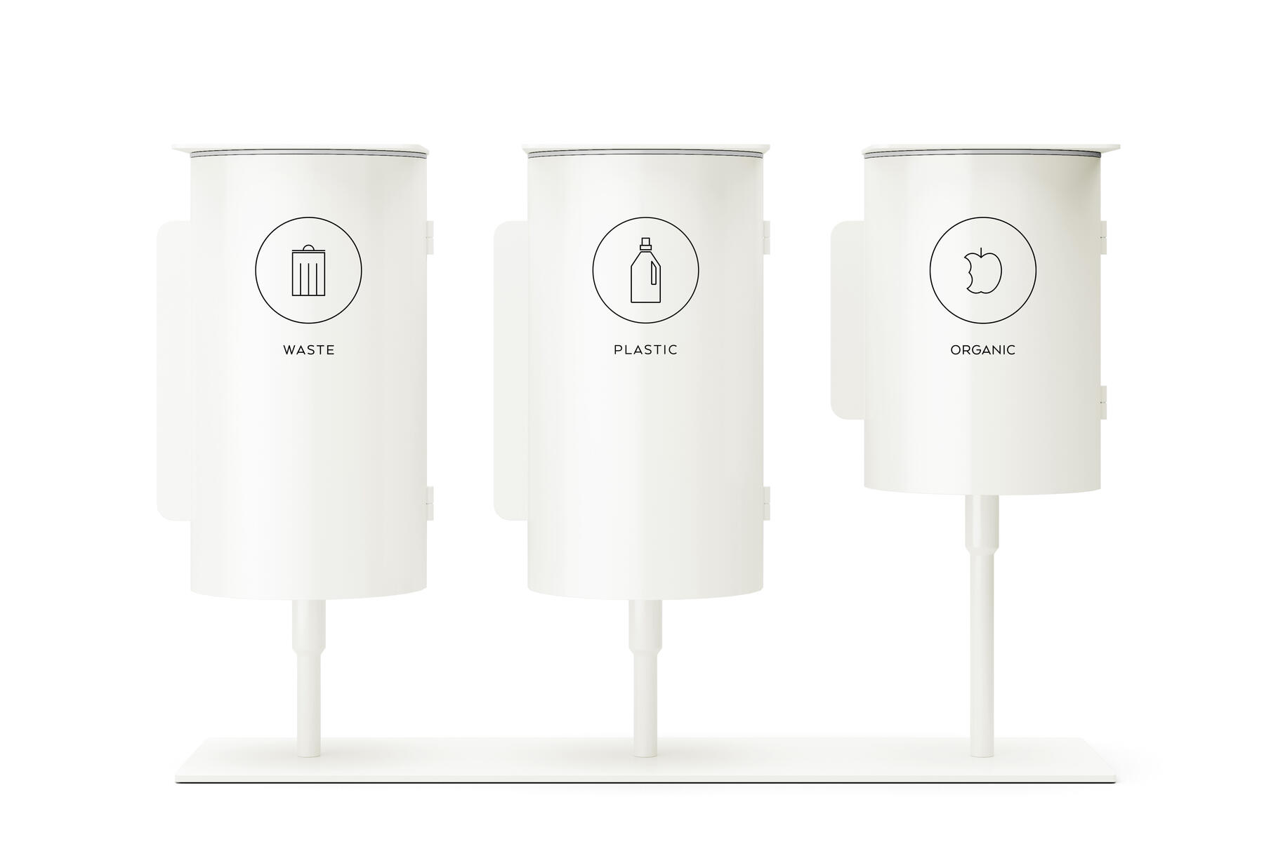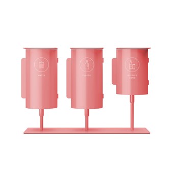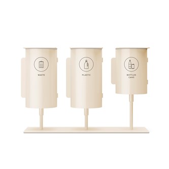 Mobilt affaldssortering med kabinet i laminat. Fem hjul hvoraf to er låsbare (foran). Soft close med magnet i hver dør. Udtræk til affaldsposer og gummimåtte medfølger. Vælg farven på dørene. Metaldør (3 mm tykkelse). Symboler waste, plastic og bottles/ cans. Egnede affaldssække 85-125 liter.